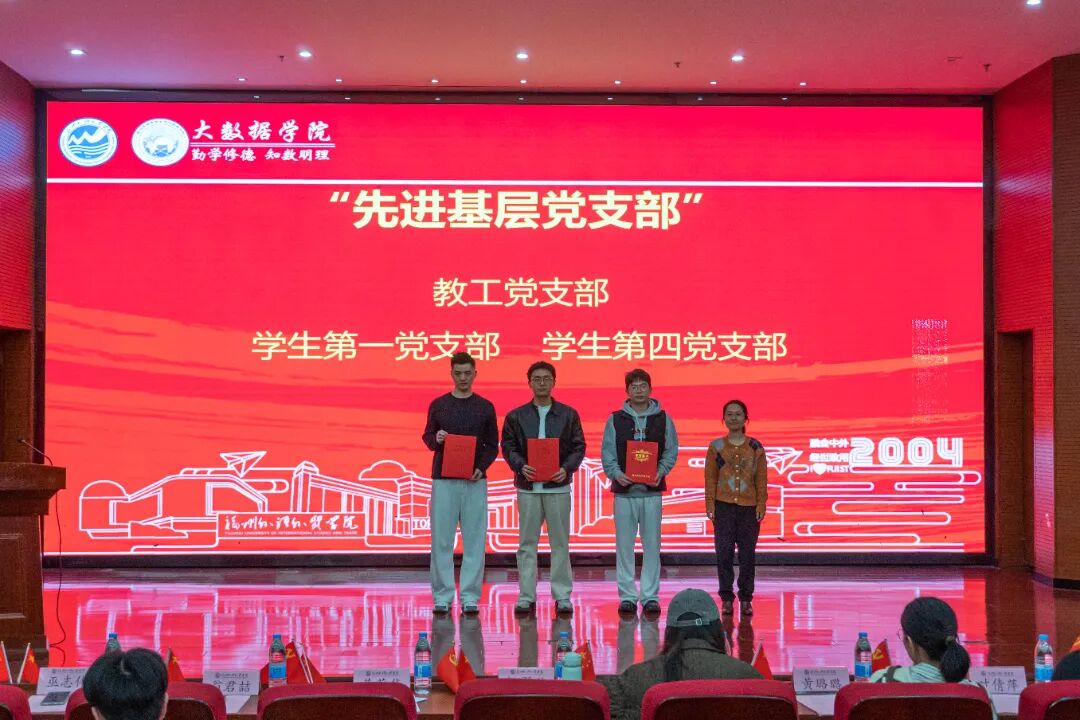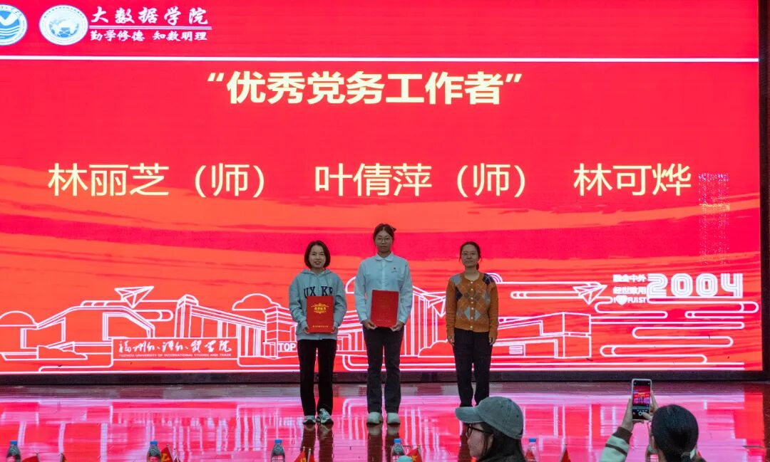 分党委副书记黄荣华老师宣读《中共福州外语外贸学院大数据学院委员会关于表彰优秀共产党员、学习强国学生标兵、优秀党务工作者、先进基层党支部的决定》