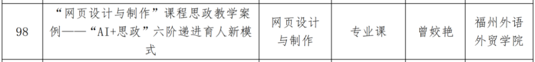 捷报频传,福建省高校课程思政教育联盟公布了第三批课程思政优秀教学案例征集人选名单,我院曾姣艳老师申报的"网页设计与制作"课程思政教学案例一"AI+思政"六阶递进育人新模式成功入选。