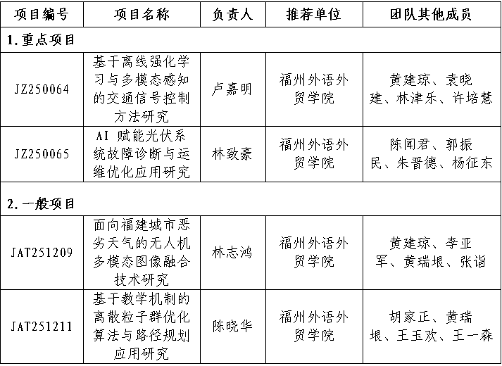 近日,福建省教育厅公布了《2025年度福建省中青年教师科研项目(科技类)立项名单的通知》,我院卢嘉明、林致豪老师撰写的项目成功获批重点项目,同时,我院林志鸿、陈晓华老师撰写的项目成功获批一般项目。