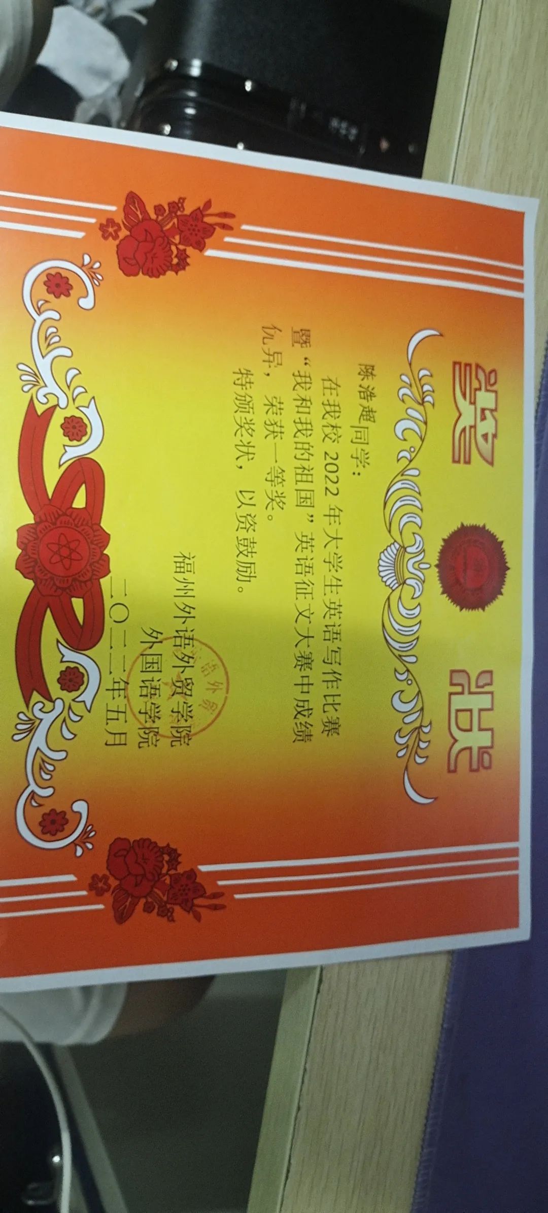 2.2021-2022学年 福州外语外贸学院 大学生英语征文比赛一等奖;