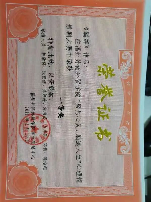 3.2020-2021学年 福州外语外贸学院 “聚焦心灵,剧透人生”心理情景剧大赛校一等奖;