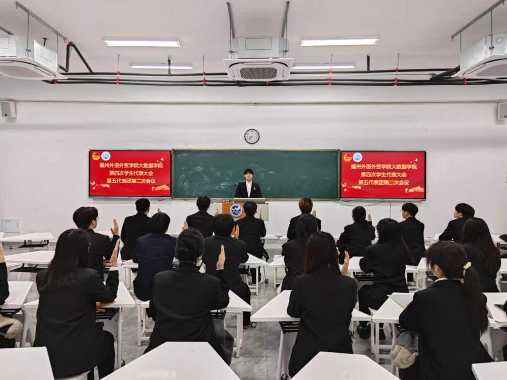 【聚焦学代会】大数据学院第四次学生代表大会顺利召开 2024年12月26日18时,福州外语外贸学院大数据学院第四次学生代表大会在博雅音乐厅隆重召开。大数据学院分党委书记、副院长汪翠茹,大数据学院团委书记、办公室副主任黄荣华,校团委学生会轮值主席邢燕姿,大数据学院团委常务副书记黄椤茜及大数据学院全体辅导员一同出席会议。 一、开幕式 01 全体起立奏唱国歌 大会正式开始 02校团委学生会轮值主席邢燕姿致辞 开幕式上,校团委学生会轮值主席邢燕姿同学代表校团委向大会的召开表示热烈的祝贺!她表示,大数据学院始终紧抓学校高等教育大发展的有利时机,发扬福外人特有的“精气神”,锐意进取、追求卓越。希望各位代表在学校申硕及审核评估期间,能认真履行职责,充分发挥桥梁和纽带作用,团结带领全院同学,以更加饱满的热情、更加昂扬的斗志,为大数据学院的发展贡献青春力量。 03学院分党委书记、副院长汪翠茹致辞 大数据学院分党委书记、副院长汪翠茹代表大数据学院向本次学生代表大会的顺利召开表示热烈的祝贺!她表示,本次学代会的召开,是学院政治生活中的一件大事,也是全体同学共商学院发展大计、共谋学生成长蓝图的一次盛会。 学院重视学生工作,期望同学们成长为理想远大、专业精深、体魄强健、心境恬美的建设者和接班人。学生会应紧密联系青年,助力成长成才。当前学院处于审核评估关键期和申硕重要阶段,希望同学们能够做到以下三点:坚定理想信念,成为中华民族伟大复兴的时代新人,树立共产主义理想信念,为中华民族伟大复兴而奋斗;加强共产主义理论学习,筑牢政治忠诚,深入领会习近平总书记相关论述,践行社会主义核心价值观,坚持德、智、体、美、劳全面发展;坚定人民立场,将人生价值融入国家民族事业,服务奉献社会,凝聚青春力量。 汪翠茹书记希望新一届的团学干部要协同探寻适应学校学生状况的服务理念与方式,铸就学生信得过、用得上、离不开的团委学生会。 二、第一次全体会议 01大数据学院第三届学生委员会代表吴加旭同学作工作汇报 吴加旭同学代表大数据学院第三届学生委员会向本次学生代表大会的顺利召开表示热烈的祝贺!他表示,过去一年,在学院分党委的正确领导下,在校团委和院团委的悉心指导和全院青年学子的团结配合下,努力成长为有理想、敢担当、能吃苦、肯奋斗的新时代青年,为学院事业发展作出新贡献。希望各位代表未来能够厚植家国情怀,心存高远之志,勇担时代使命,团结带领学院广大同学牢记青春使命,努力谱写学生会工作发展的新篇章。 02主席团候选人竞选演讲 (许铃婧) (吴家航) (林诗雅) (洪友福) (倪俊豪) 三、各代表团第二次会议 各代表团分团讨论审议大数据学院第三届学生委员会工作报告;审议福州外语外贸学院大数据学院学生会章程(草案);审议福州外语外贸学院大数据学院第四次学生代表大会常任代表候选人建议名单;讨论福州外语外贸学院大数据学院第四次学生代表大会大会决议(草案)。 四、第二次全体会议 在各代表团审议之后开始召开第二次全体会议,审议通过福州外语外贸学院大数据学院学生会章程(草案)、通过福州外语外贸学院大数据学院第四次学生代表大会常任代表选举办法(草案)、通过福州外语外贸学院大数据学院第四次学生代表大会主席团选举办法(草案)。 会议通过大会选举总监票人、监票人和总计票人、计票人建议名单;由主持人赵晨曦宣读福州外语外贸学院大数据学院第四次学生代表大会常任代表候选人名单、第四届学生委员会主席团候选人名单以及第四届学生委员会主席团名单。 总监票人向大会报告选举计票结果 黄荣华老师宣布当选福州外语外贸学院大数据学院第四次学生代表大会常任代表名单、第四届学生委员会主席团成员名单。 五、闭幕式 闭幕式上,黄荣华老师祝贺大会圆满成功,并且对新当选的常任代表、主席团成员表示衷心的祝贺!希望各位代表以本次大会为契机,不忘初心、牢记使命,坚定跟党走,奋进新时代,高举习近平新时代中国特色社会主义思想伟大旗帜,深刻领会党的二十大的主题。高举中国特色社会主义伟大旗帜,全面贯彻习近平新时代中国特色社会主义思想,弘扬伟大建党精神。牢记福外学子所肩负的历史使命,勤奋学习、勇于创新、锐意进取、奋发有为,为我校加快建成富有鲜明特色的全国一流民办大学、实现中华民族伟大复兴的中国梦,贡献青春力量,谱写青春华章! 风好正是扬帆时,奋楫逐浪向未来。我们相信,在新一届学生会的带领下,数院学子必将乘风破浪,将“融会中外,经世致用”的校训镌刻在心,让“崇德、勤学,求实、创新”的校风精神薪火相传,迎接未来的无限可能,为创造大数据学院新辉煌继续奋斗! 大数据学院办公室 2025年1月2日