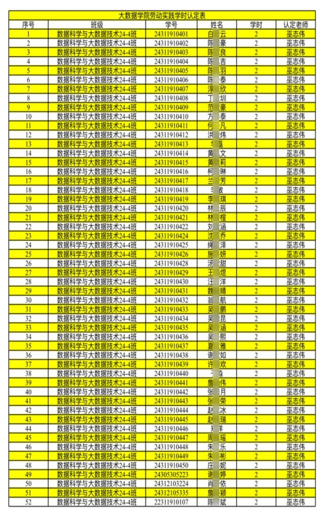 【劳动筑基 实践育人】第十周劳动实践纪实 秋意渐深,天朗气清。11月4日,大数据学院数据科学与大数据技术24-3班、数据科学与大数据技术24-4班和人工智能25-3班、人工智能25-4班的同学们,怀揣着对校园的热爱,分别奔赴指定区域,开展了一场有序且充实的校园清洁劳动实践活动,用双手为校园环境“焕新颜”。 活动开始前,各班结合清洁区域特点,提前做好分工安排:数科24-3班负责教工宿舍1号楼到东区10、11号学生宿舍楼周围的主干道与绿化带,数科24-4班则聚焦东区后门到风车处、北区到东区6号学生宿舍楼新建栈道及6号宿舍楼周围的主干道、栈道与绿化带。人工智能25-3班负责宿舍1号楼周边绿化带及主干道,人工智能25-4班负责校门口周边绿化带及主干道。明确的区域划分,让同学们一到现场便迅速进入状态。 手持垃圾夹、垃圾袋等工具,同们化身校园“美容师”,认真清扫每一处角落。主干道上,大家弯腰捡拾散落的纸屑、塑料瓶,确保路面干净整洁;绿化带中,有人细致清理隐藏在草丛里的烟头、杂物,避免垃圾污染土壤;新建栈道上,同学们更是格外用心,逐一擦拭栏杆、清理缝隙中的灰尘,让崭新的栈道始终保持清爽模样。劳动过程中,没有同学叫苦喊累,大家相互配合、彼此协助,遇到较重的枯枝落叶,便几人合力搬运,默契十足的身影成为校园里一道亮丽的风景线。 此次劳动实践,不仅让校园环境变得更加洁净雅致,更让同学们在亲身实践中体会到劳动的价值。看着自己清扫后的区域焕然一新,同学们脸上都洋溢着满满的成就感。大家纷纷表示,今后会更加珍惜校园环境,也愿意继续参与此类劳动活动,用实际行动守护校园的美好。 劳动虽短,意义绵长。同学们用汗水诠释了责任与担当,也为共建美丽校园注入了青春力量。相信这份劳动精神会持续传递,带动更多同学共同维护校园环境,让我们的校园始终焕发勃勃生机! d 附下周劳动实践安排 本周劳动实践学时认定表 大数据学院办公室 2025年11月8日