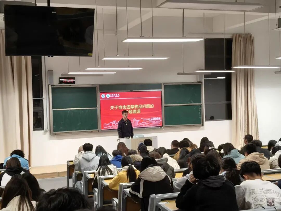 班会上,各专业导员逐字逐句解读《学生宿舍管理规定》,重点明确大功率电器、管制刀具、易燃易爆品、违规充电设备等违禁品具体清单。同时,详细说明违规存放、使用违禁品的处罚标准,让学生清晰知晓 “不可为” 的边界,从思想上绷紧安全之弦。
