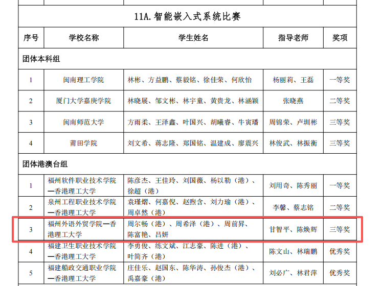 近日,第十二届海峡两岸暨港澳大学生职业技能(能力)大赛“智能嵌入式系统”赛项圆满落幕。大数据学院数智融创产业学院陈焕辉、甘智平两位老师带队参赛,学子们在港澳台组激烈角逐中表现亮眼,凭借扎实的专业能力与创新实践成果,最终荣获三等奖!