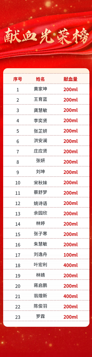 【献血风采】(第五期)心有雷锋志,热血传温情!大数据学院开展无偿献血活动 为厚植青年担当、传递生命温度,大数据学院于2026年3月17日,在长乐校区行健体育馆与滨海校区竞帆体育馆同步启动“心有雷锋志,热血传温情”无偿献血公益活动。学子们踊跃响应,以涓涓热血汇聚暖流,用实际行动践行青春使命,为生命续航注入坚实力量。 活动筹备阶段,志愿者们便早早奔赴现场,为活动的进行保驾护航。不论是签到登记区醒目的指引标识,还是后勤补给点的物资清点,每一处都体现了志愿者的严谨细致,致力于让每一位参与者都能感受到便捷与安心,让这场爱心行动在有序高效中顺利推进。 等候区里,完成献血的同学静坐休憩,交谈分享感受。学院贴心准备的补给物资已陆续到位,为刚结束献血的同学补充能量,让这份奉献之旅更添安心与舒适。 医护人员的工作台前,“我献血 我健康”的桌布传递着积极理念,大家有序接受血压测量、血液初筛等检查。专业的操作、耐心的解答,让同学们在安心氛围中完成每一步流程,充分感受到组织的严谨与关怀。 能量补给区早已准备就绪,印有学院标识的牛皮纸袋整齐排列,里面装满了热饮与点心。志愿者们身披绶带端坐台前,随时准备为献血同学递上温暖补给,用贴心服务消解献血后的疲惫,让奉献者感受到来自集体的关怀。 献血榜 此次无偿献血活动既是一次爱心的凝聚与传递,更是一堂深刻而鲜活的生命教育实践。热血传递大爱,生命从不缺席;每一次伸出手臂,都是在为他人点燃希望之光。愿这份温暖不断延续,让奉献精神在校园内蔚然成风,滋养时代正气。 大数据学院办公室 2026年3月23日