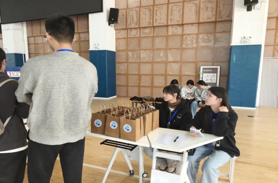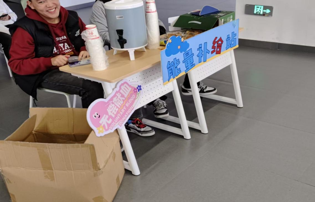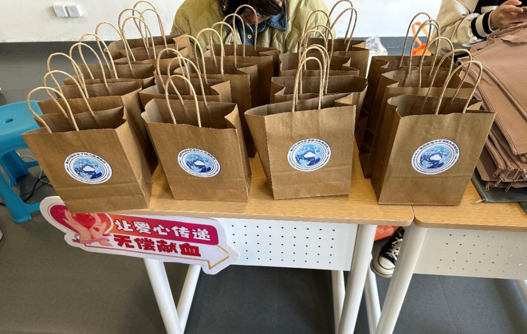 能量补给区早已准备就绪,印有学院标识的牛皮纸袋整齐排列,里面装满了热饮与点心。志愿者们身披绶带端坐台前,随时准备为献血同学递上温暖补给,用贴心服务消解献血后的疲惫,让奉献者感受到来自集体的关怀。
