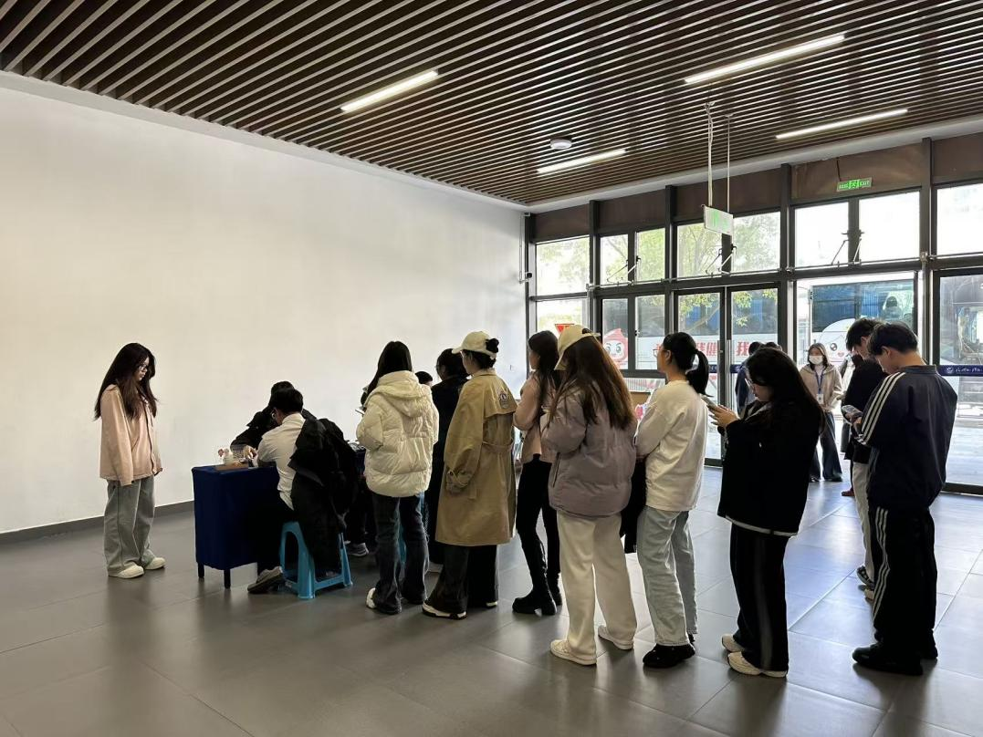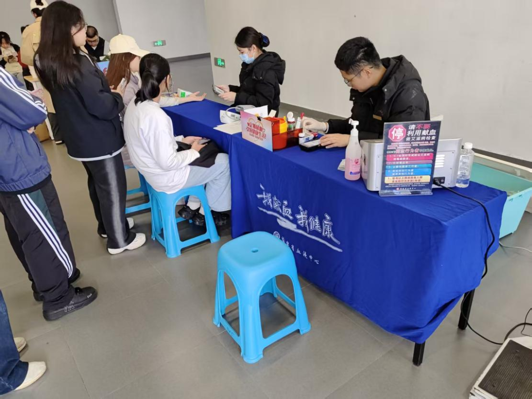 医护人员的工作台前,“我献血 我健康”的桌布传递着积极理念,大家有序接受血压测量、血液初筛等检查。专业的操作、耐心的解答,让同学们在安心氛围中完成每一步流程,充分感受到组织的严谨与关怀。