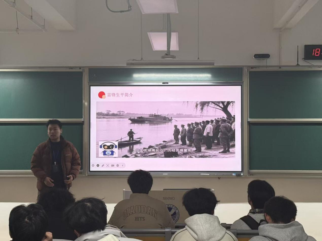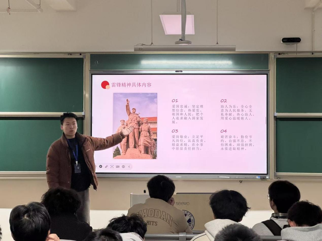 在“小数”的开篇引导后,宣讲人通过图文展示和案例剖析,从狭义的事迹思想到广义的精神文化,系统阐释了雷锋精神的核心内涵,并围绕爱国忠诚、助人为乐、爱岗敬业、艰苦奋斗四个方面,结合冒雨送大娘、省吃俭用捐津贴等经典事迹,生动呈现其鲜活内涵。同时,以张桂梅校长等为例,解读雷锋精神在新时代的责任担当、大爱精神与使命坚守,彰显其与时代同频共振的力量。最后,结合大学生实际,从坚定理想信念、立足校园生活、结合专业特色、永葆艰苦奋斗四个维度,为传承雷锋精神指明实践方向。