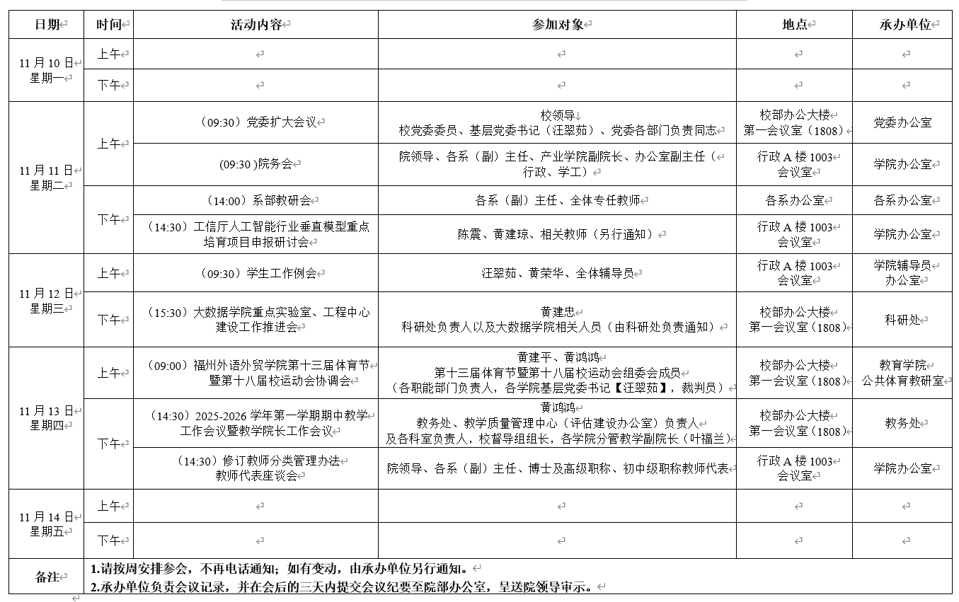 大数据学院2025-2026学年第一学期第11周活动安排表