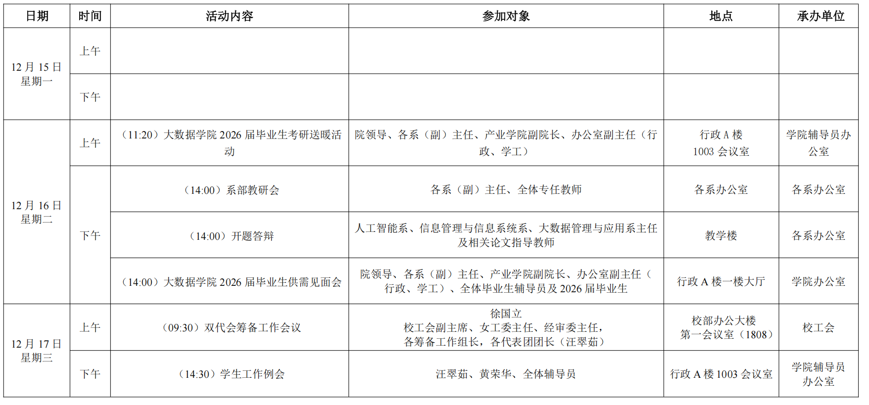 大数据学院 2025-2026 学年第一学期第 16 周活动安排表