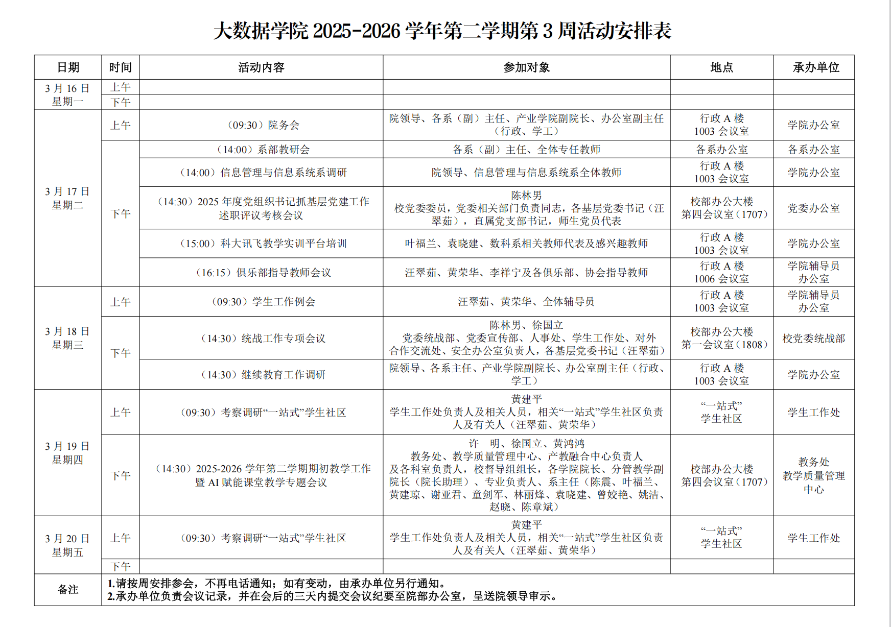 大数据学院2025-2026学年第二学期第3周活动安排表