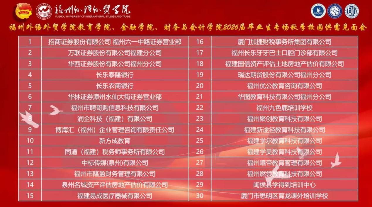 本次招聘会汇聚30家优质企业,招商证券、长乐泰隆银行、厦门加捷财税事务所等知名企业均在列,覆盖财会、金融、教育等多个领域,为你量身打造就业选择。