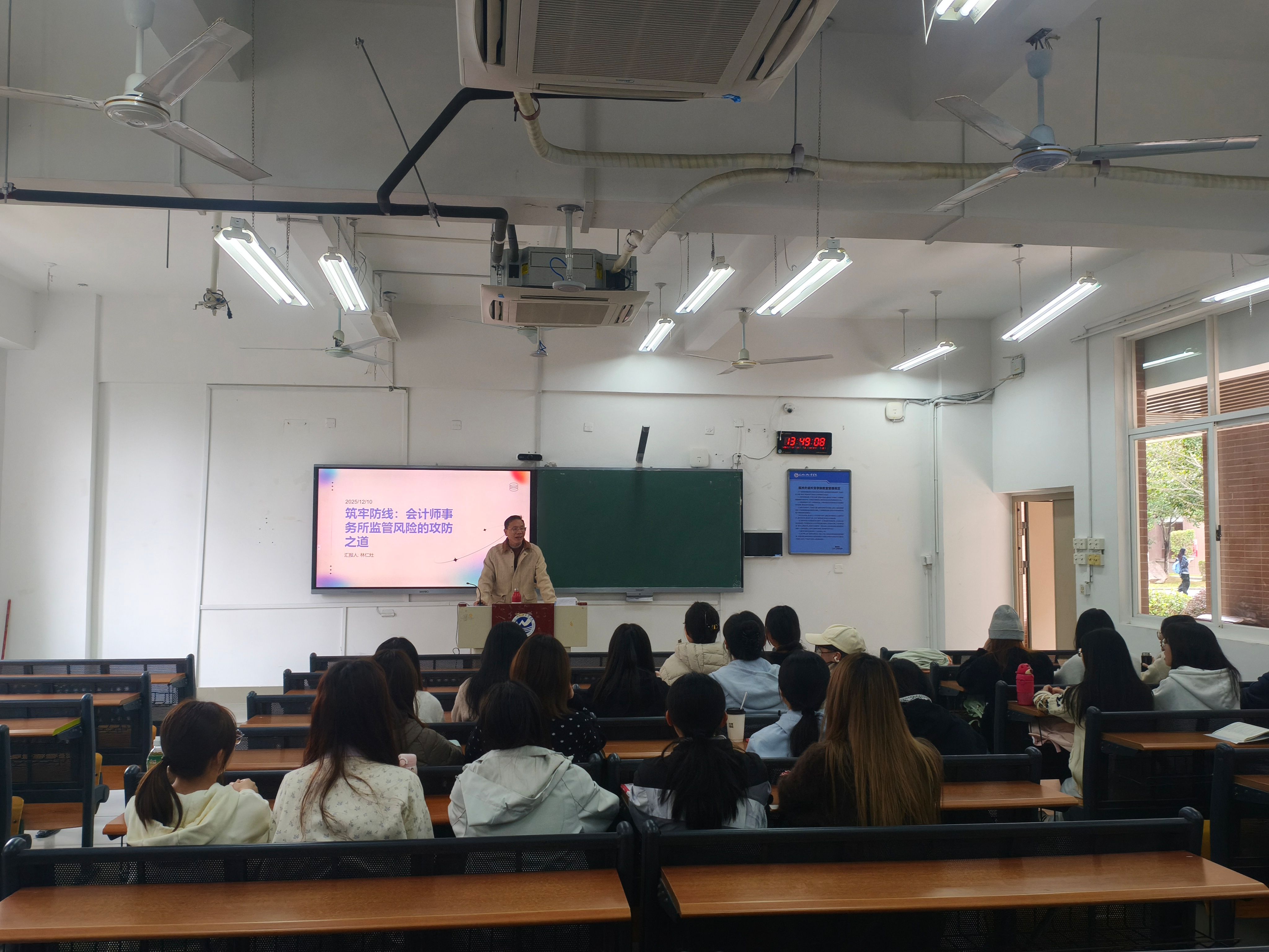 为助力2022级审计学专业学生更深入地理解会计师事务所执业风险与监管要求,2025年12月10日,林仁灶老师开展了题为“筑牢防线:会计师事务所监管风险的攻防之道”专题讲座。