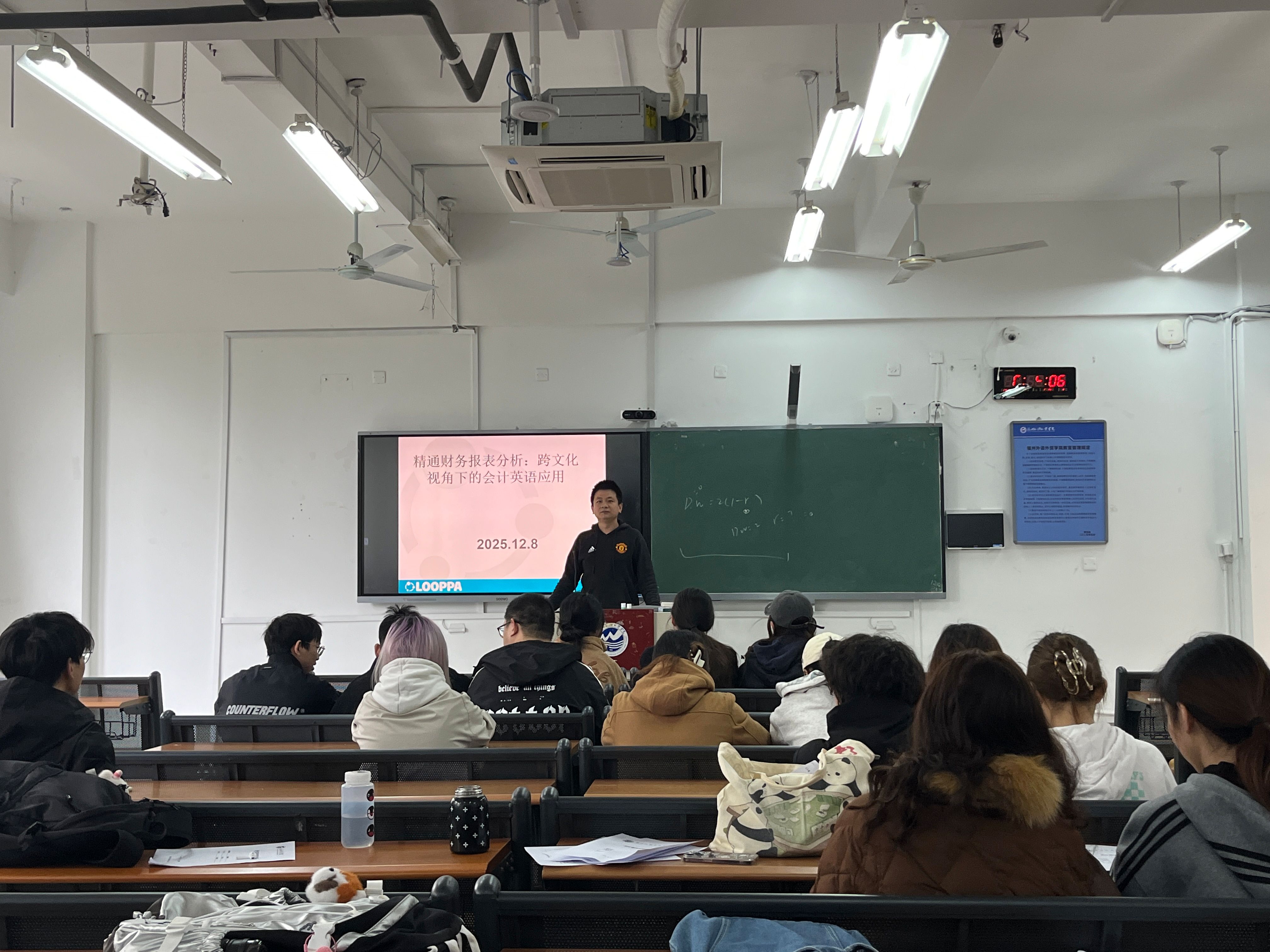 2025年12月8日,我院潘庚飞老师在教学楼教4-102为2023级会计学4班学生开展了题为“财务报表分析与跨文化会计英语应用”的专题讲座。