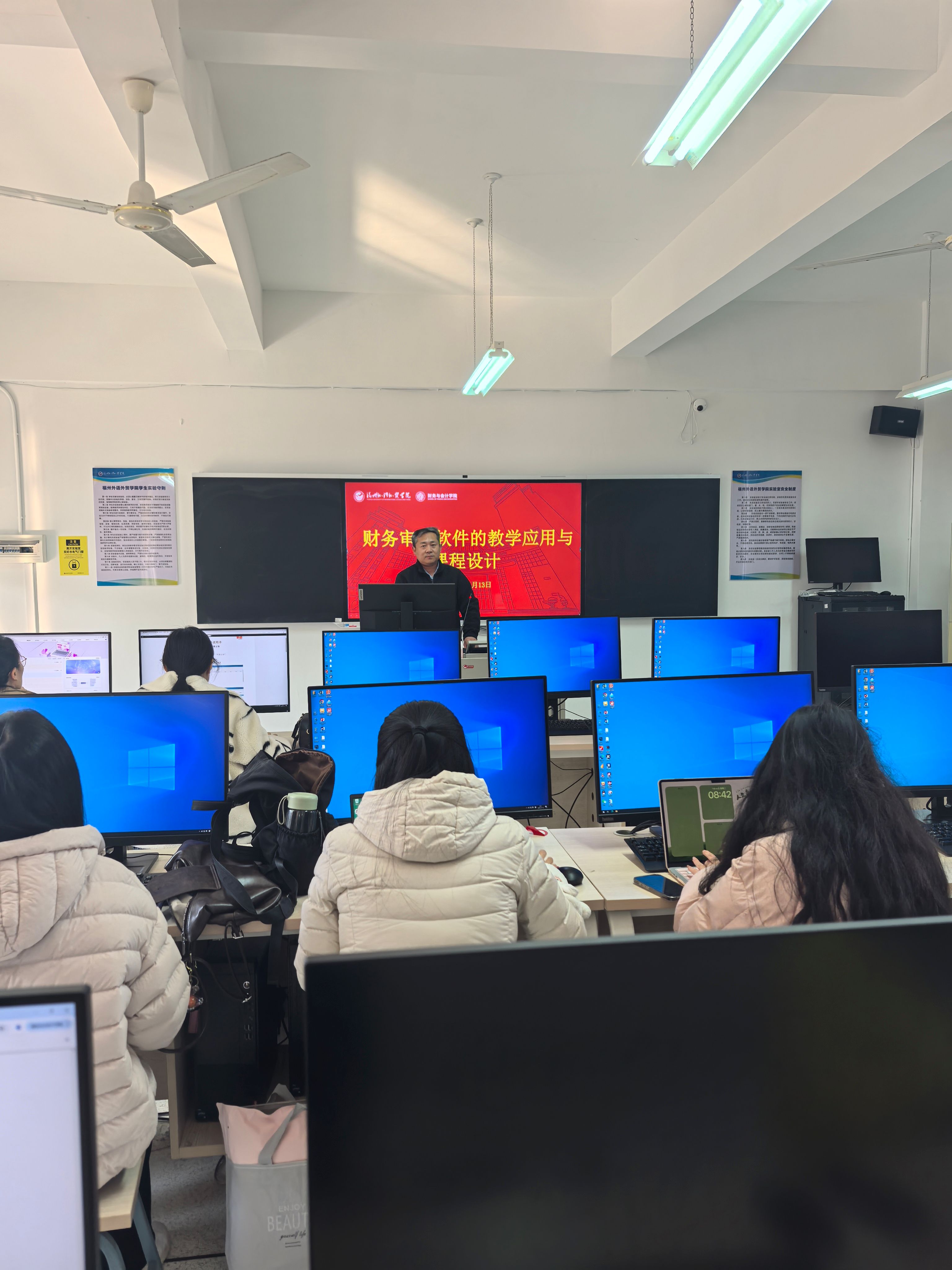 2026年1月13日8时30分,福州外语外贸学院财务与会计学院于实1-502审计仿真实验室开展了“财务审计软件的教学应用与课程设计”的培训。本次培训特邀新道科技股份有限公司梅军刚老师,他深耕财务审计软件多年,拥有丰富的实战经验,为老师们带来了行业前沿的洞察与鲜活案例。