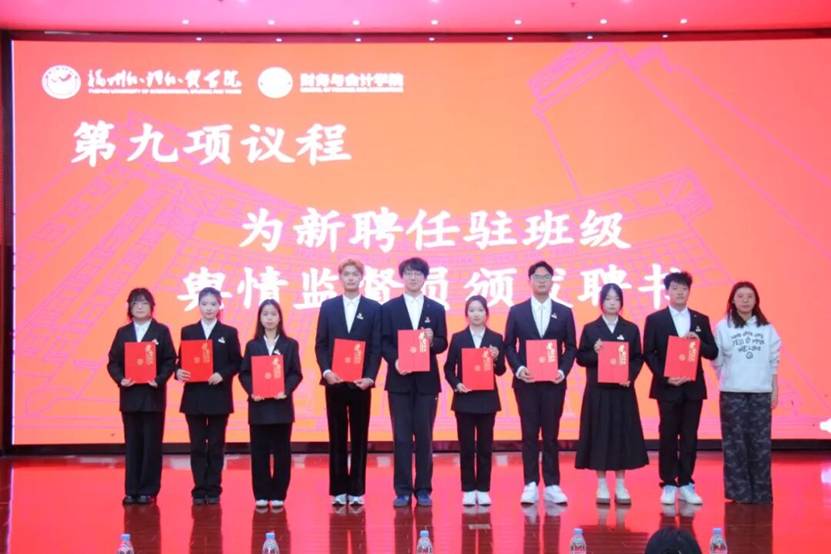 陈若琪老师宣读《中共福州外语外贸学院财务与会计学院委员会关于聘任刁宸圣等27名同学为驻班级通讯员(舆情监督员)的决定》