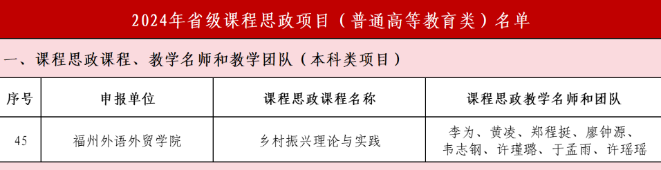 近日,福建省教育厅公布了福建高校省级课程思政项目(普通高等教育类)名单,我校《乡村振兴理论与实践》课程入选省级课程思政课程,课程负责人李为教授被认定为省级思政课程教学名师,由李为、黄凌、郑程挺、廖钟源、韦志钢、许瑾璐、于孟雨、许瑶瑶等教师组成的教学团队被认定为省级课程思政教学团队,这不仅是对我院教学团队的高度认可,更是学校在内涵建设上的又一重要成果。