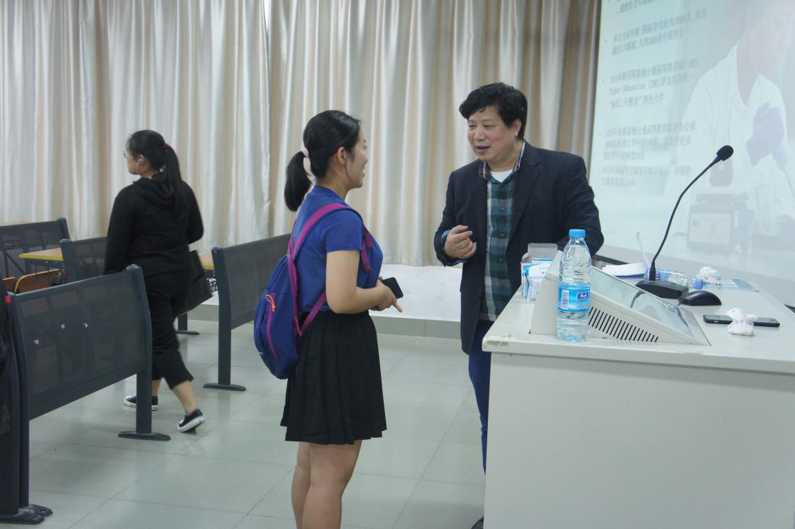 会后,林新法从自身留学英国的经历与经验出发,向我校各专业近四百名学生介绍了剑桥地区大学的概况。林新法首先与学生们一同吟诵了徐志摩先生的《再别康桥》,引出安格利亚鲁斯金大学主校区的地理位置,继而介绍英国的地理概况。林新法以自身学习经验出发,激励学生们学好英语。他列举了英式英语与美式英语的异同,并介绍了英语与广东话的相似之处。活动最后,林新法与同学们热烈互动,问答十分精彩。讲座赢得同学们的热烈掌声。