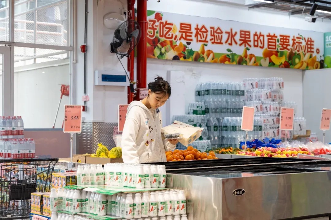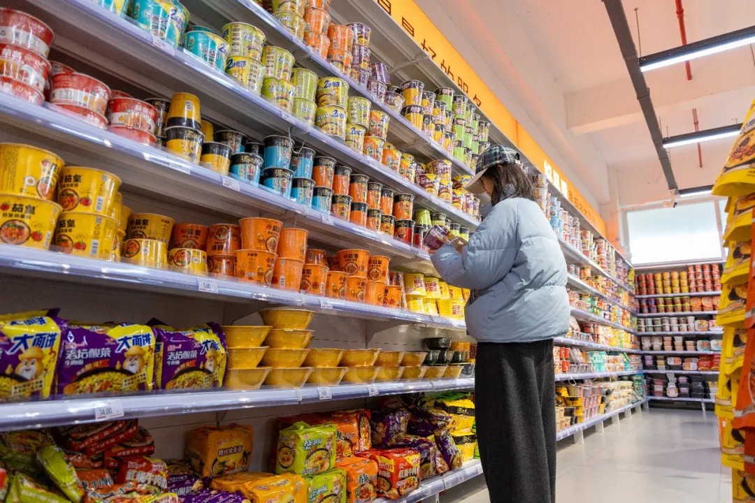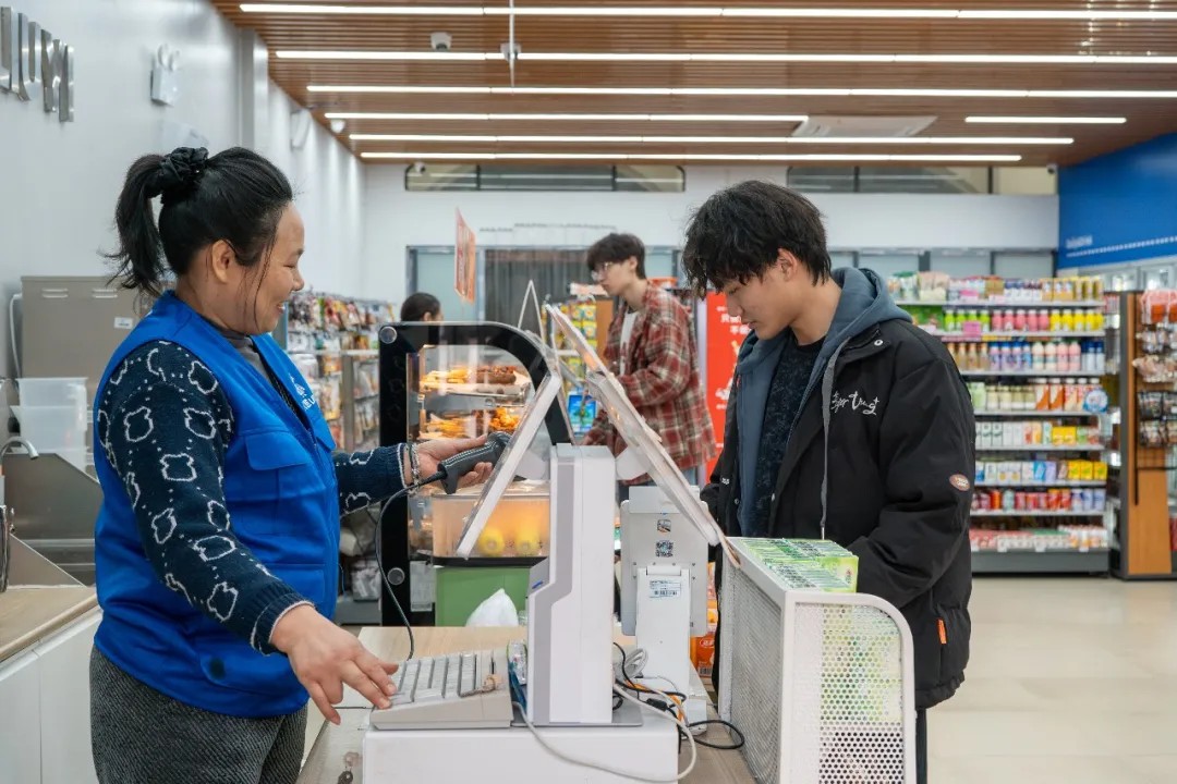 同学们站在货架前认真挑选