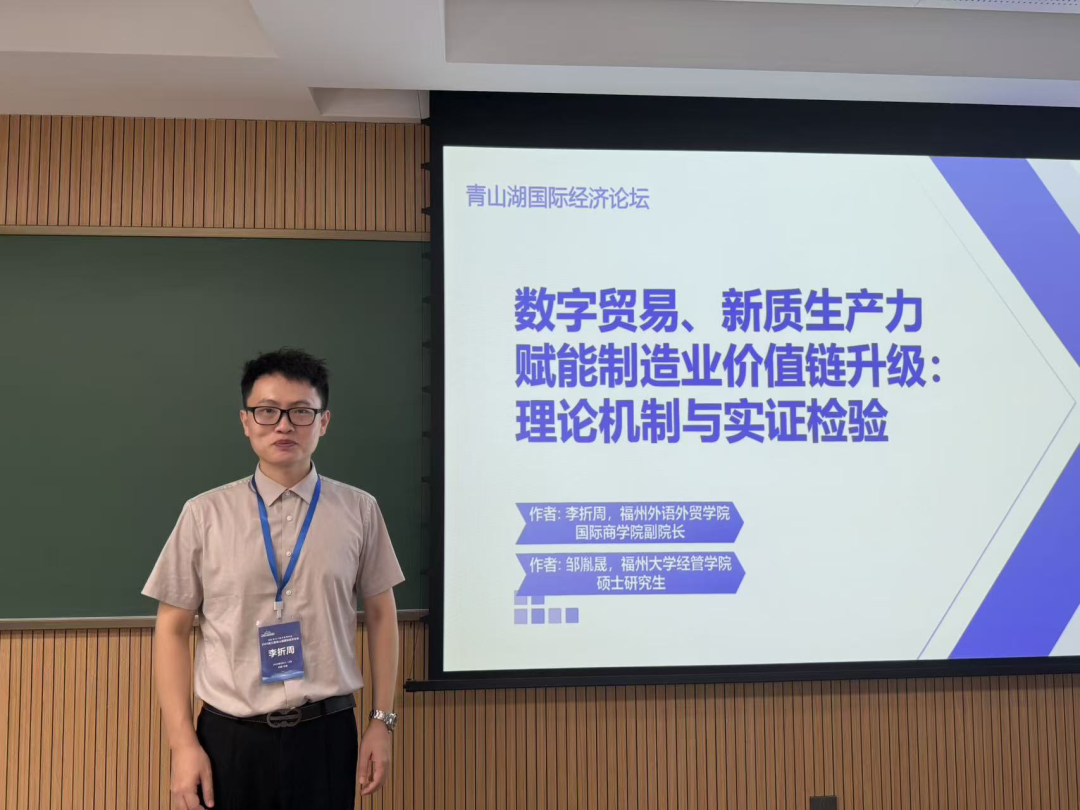 论坛期间,国际商学院副院长李折周受邀出席,并在院长学术报告会(三)中作题为“数字贸易、新质生产力赋能制造业价值链升级:理论机制与实证检验”的主旨报告。该报告紧扣时代脉搏,聚焦数字贸易与新质生产力对制造业价值链升级的关键作用,通过严谨的理论分析与详实的实证检验,深入剖析了其中的内在机制与发展路径,为相关领域的研究提供了新的视角与思路,引发了与会学者的广泛关注与热烈讨论。