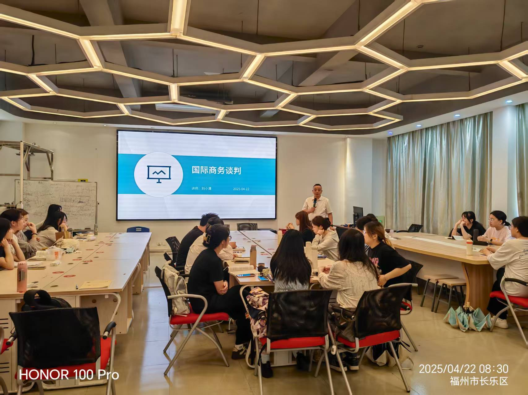 本学期国际经济与贸易系秉持产教融合理念,积极开展校企合作,成功邀请海狮集团刘小清副总裁走进校园,为国贸系2023级全体学生带来《国际商务谈判》校企联合授课,开启了一场精彩纷呈的校企协同育人之旅。作为学院资深企业导师,刘小清副总凭借其深厚的行业背景与丰富经验,将企业真实谈判案例巧妙融入课堂教学。他精心设计课程内容,从国际商务谈判的前期准备、策略制定,到谈判过程中的沟通技巧、应对策略,再到最终达成协议的关键要点,全方位、多维度地为学生们呈现了国际商务谈判的全貌。