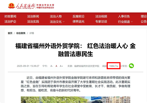 此后,学院八支青年实践队如繁星般散落八闽大地,从榕城到畲乡,从长汀到惠安,累计形成调研报告15份,走访农户85户,发放宣传资料200份,开展宣讲讲座21场,受益群众300人制作实践视频18个。实践事迹获中国网、中华网、人民网、人民日报、东南网、人民法治网等国家级、省级主流媒体报道18篇次,并且最高单篇浏览人次达到1600w+,取得了丰硕的实践成果和广泛的社会影响。