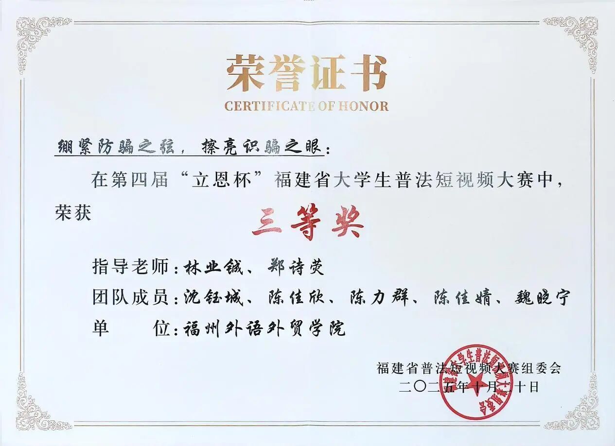 经激烈角逐,由我院学子的参赛作品《绷紧防骗之弦,擦亮识骗之眼》(参赛学生:沈钰城、陈佳欣、陈力群、陈佳婧、魏晓宁;指导教师:林业铖、郑诗荧)荣获全省三等奖。