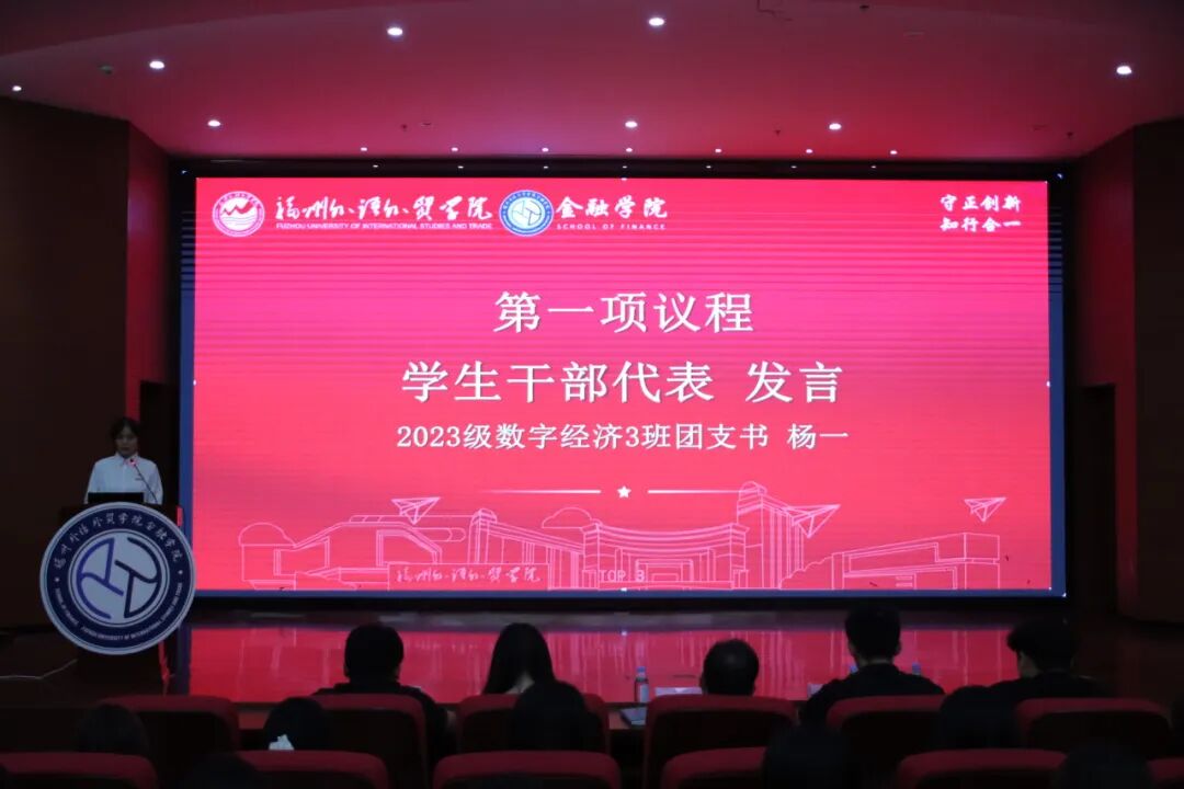 大会第一项议程,由2023级数字经济3班团支书杨一同学作为学生干部代表发言。杨同学表示,学生骨干应率先垂范,以身作则,充分发挥先锋模范作用,努力做好优秀模范榜样。她强调,要尽力带动全体同学以饱满的热情和扎实的行动投身评估工作,展现金融学子的良好风貌。