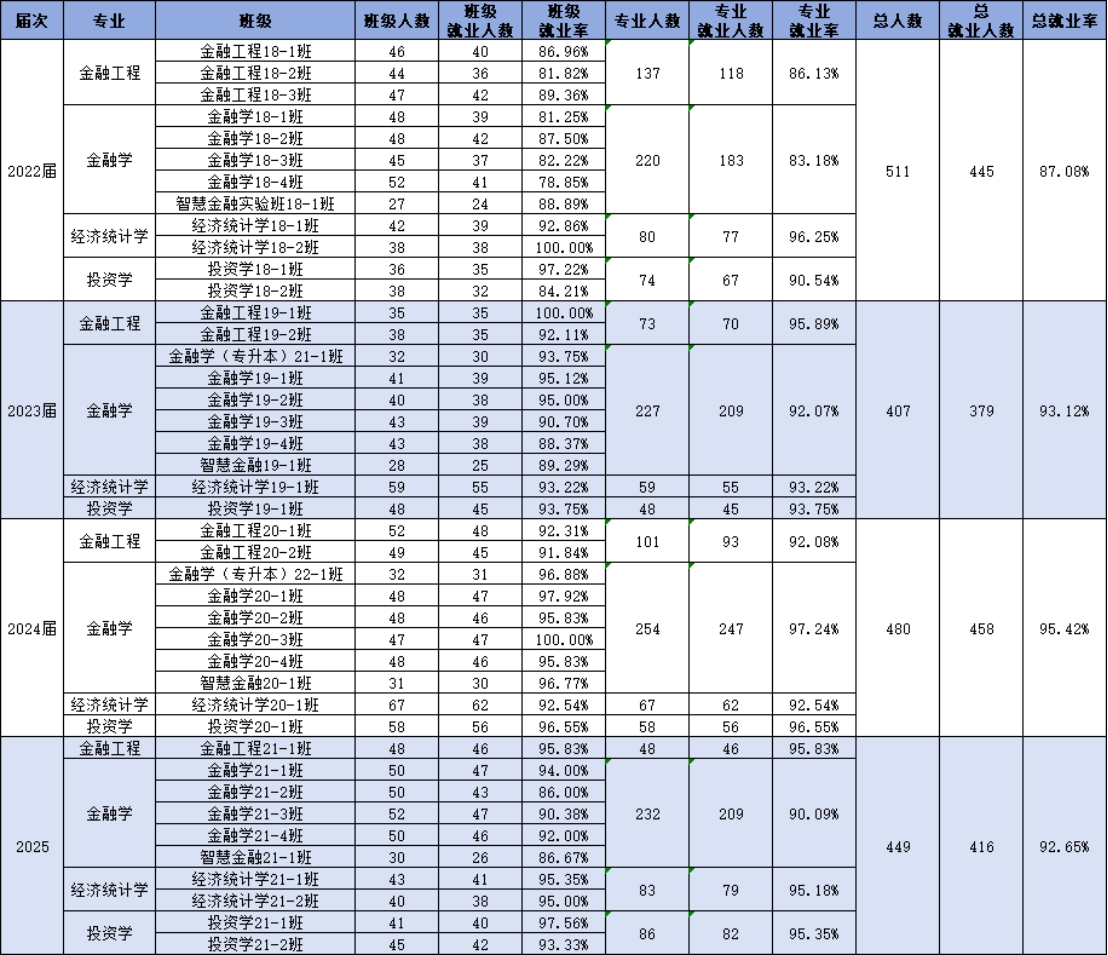 截至2025年9月18日,2025届毕业生总体就业率92.65%,其中,金融工程专业95.83%,金融学专业90.09%,经济统计学专业95.18%,投资学专业95.35%。