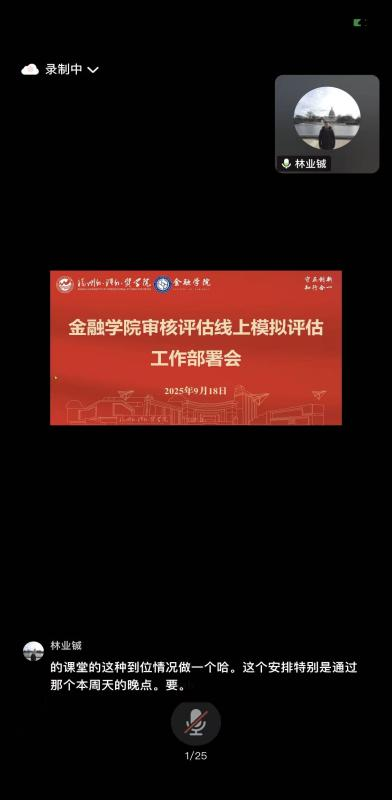 学院副院长、党委书记林业铖聚焦线上审核模拟评估期间的课堂教学秩序提出要求。他强调,全体教师需以高度责任感和良好精神面貌投入评估准备,通过严肃课堂纪律、强化学生考勤、优化教学内容等举措,切实提升学生到课率与课堂参与度,以扎实的课堂成效展现金融学院的教学质量与育人水平。