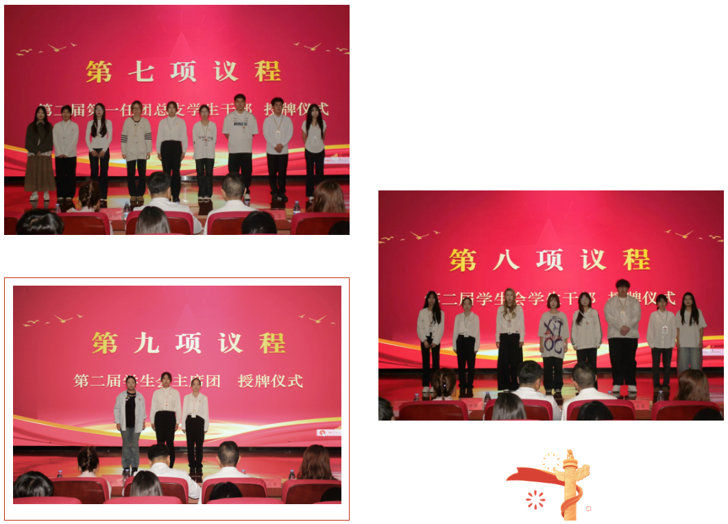 随后,周江碧宣读新一届学生干部任命文件,明确任职名单与岗位职责,为学生组织规范运行提供保障。在全场师生见证下,大会依次举行第二届学生会、团总支、学生会主席团及团委副书记授牌仪式,崭新牌匾承载使命与期望,标志着团学工作薪火相传、开启新程。