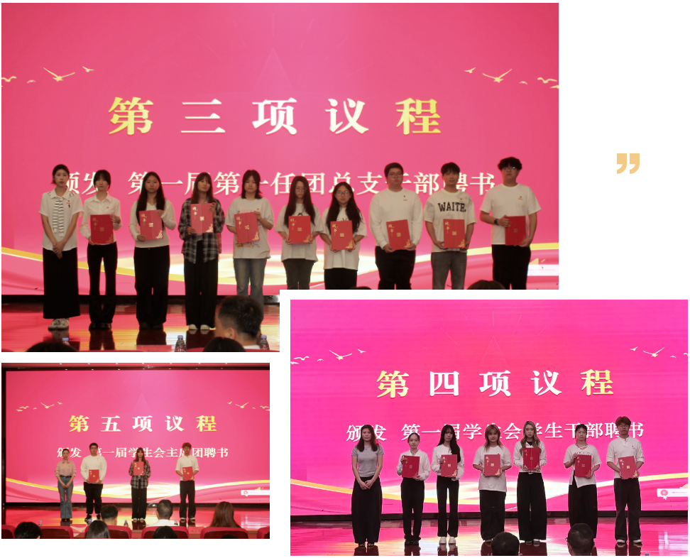 表彰与聘任环节有序推进。黄美玲、龙美菊、郭雅丽分别为第一届学生会干部、团总支干部、学生会主席团成员颁发聘书,表彰他们任期内为学院学生工作的辛勤付出与积极贡献。