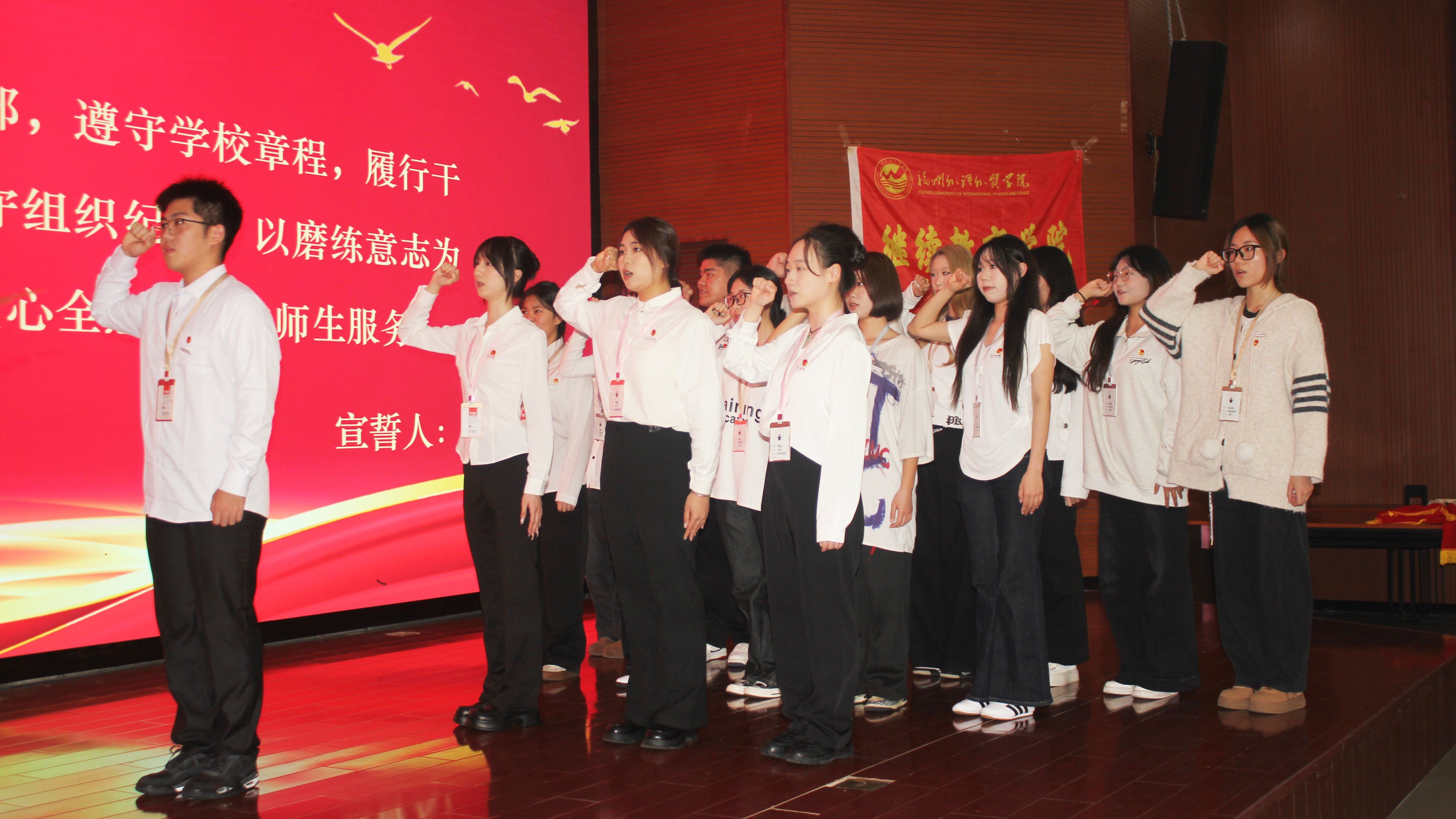 就职宣誓环节将大会气氛推向高潮。全体新任学生干部面向团旗,举拳庄严宣誓:“坚定理想信念,践行服务宗旨,严守纪律规矩,勇于担当作为……” 铿锵誓言响彻会场,既是服务同学、奉献学院的郑重承诺,也是新时代青年使命担当的生动诠释。