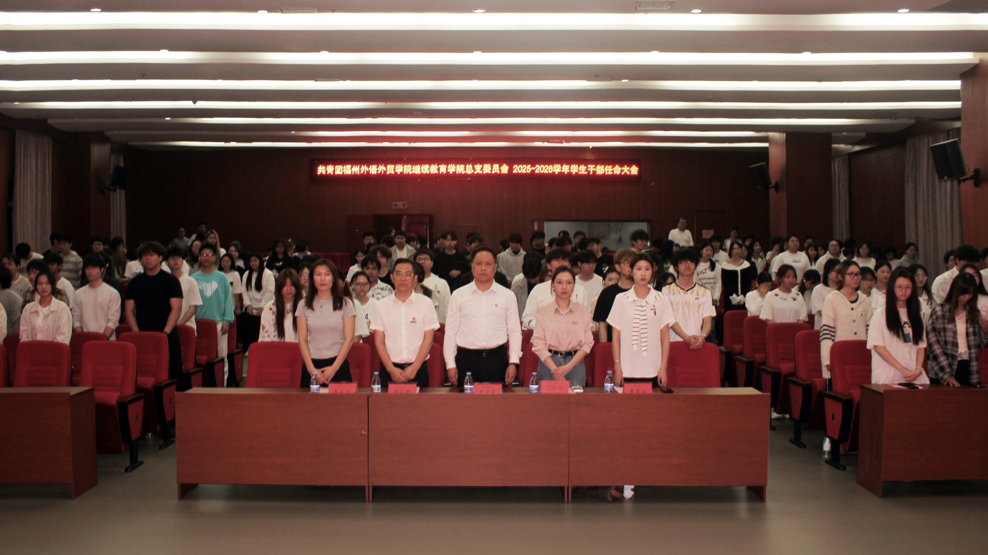 为发挥学生干部示范引领作用,凝聚青年奋进力量,4月14日,继续教育学院团总支在行政A楼五楼学术报告厅隆重召开2025-2026学年学生干部换届大会。学院直属党支部书记、常务副院长李彦军,学工部主任周江碧,办公室主任郭雅丽,办公室副主任龙美菊,团总支副书记黄美玲及全体辅导员出席,全院学生参会,大会由林月涵同学主持。