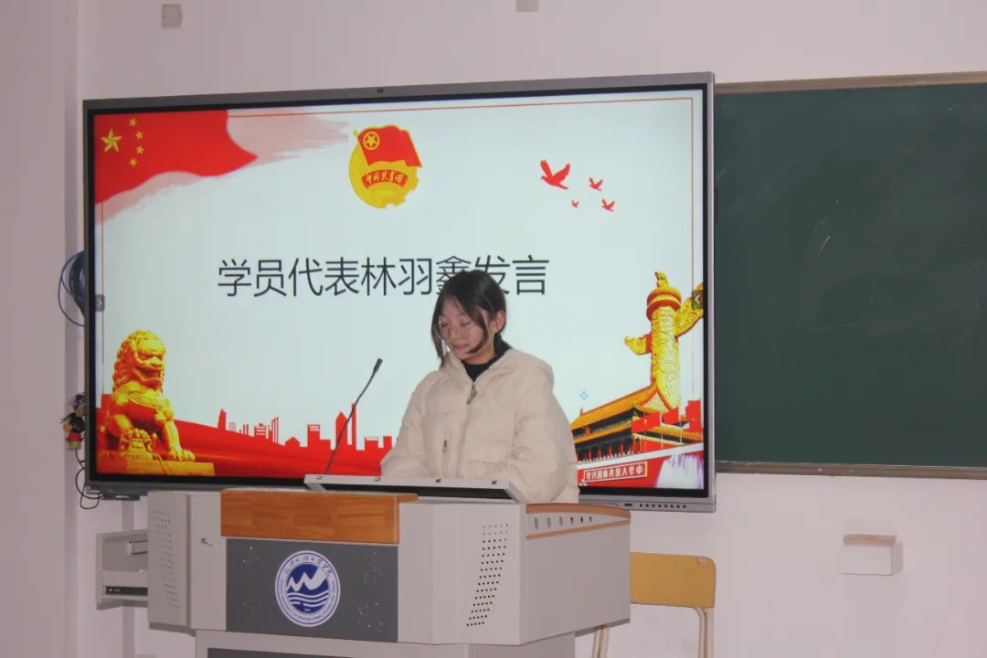 学员代表林羽鑫上台分享心声。她结合对共青团的深刻认知与入团初心,深情讲述了申请入团的心路历程,郑重表达了珍惜培训机遇、主动向团组织靠拢的坚定信念。“我将以饱满热忱投入学习,深耕团的理论知识,积极参与实践历练,以团员标准严格自律,争取早日加入共青团,为组织注入青春活力。”她的发言道出了全体学员的共同心声。