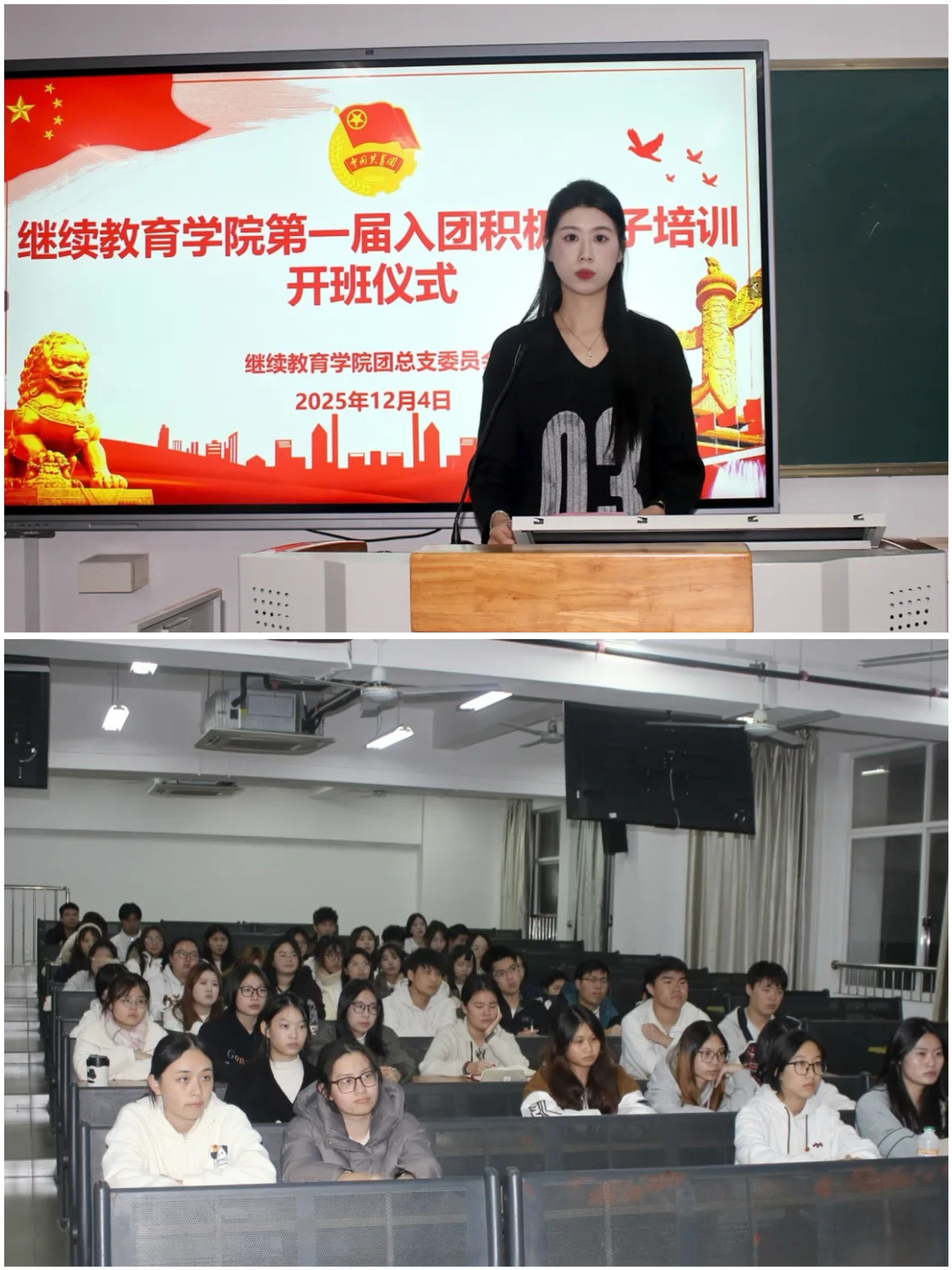 为扎实推进共青团发展团员工作,深化入团积极分子培养教育,筑牢青年思想信仰根基,12月4日下午,继续教育学院第一届入团积极分子培训开班典礼在教1-201教室隆重举行。继续教育学院直属党支部书记、常务副院长李彦军,学工部主任周江碧及全体辅导员出席典礼,典礼由学院团总支副书记黄美玲主持。