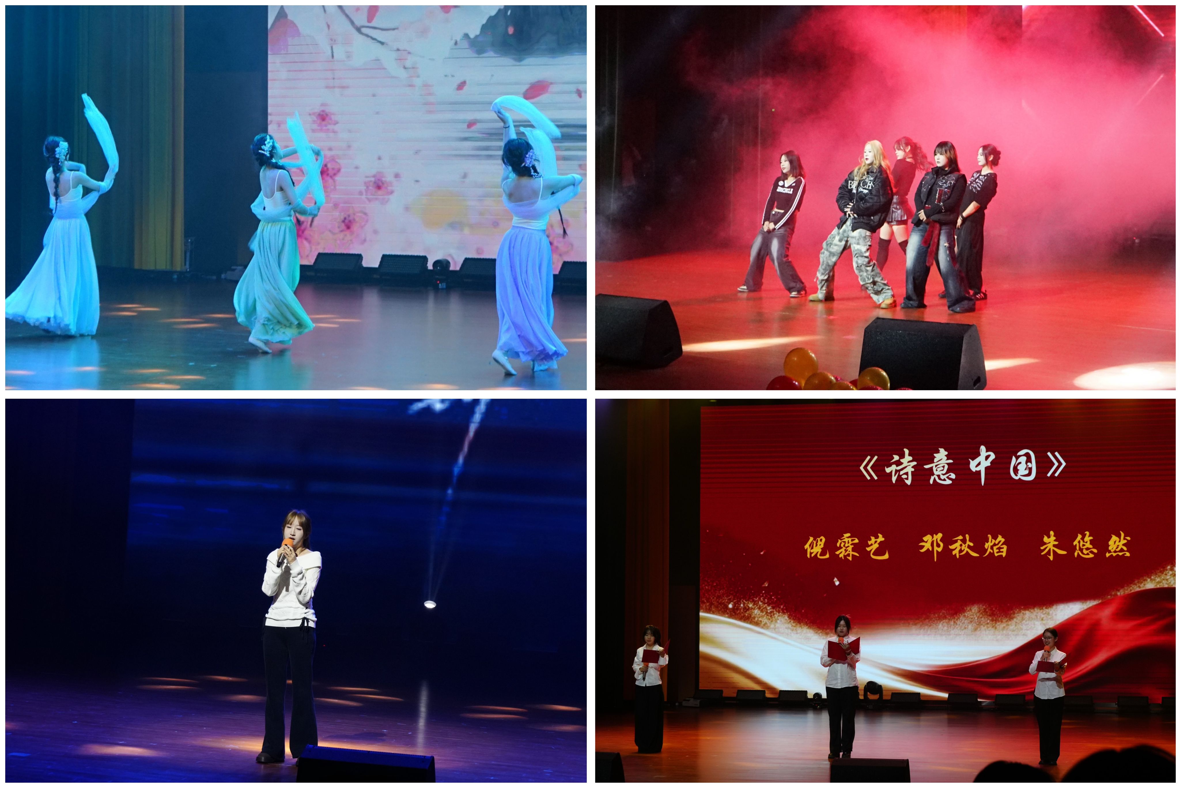 颁奖告一段落,精彩表演无缝接续。古典舞《一梦惊鸿》尽显东方韵味,独唱《天空之外》涤荡浮躁,现代舞《Wicked》迸发青春活力,朗诵《诗意中国》引全场共鸣。