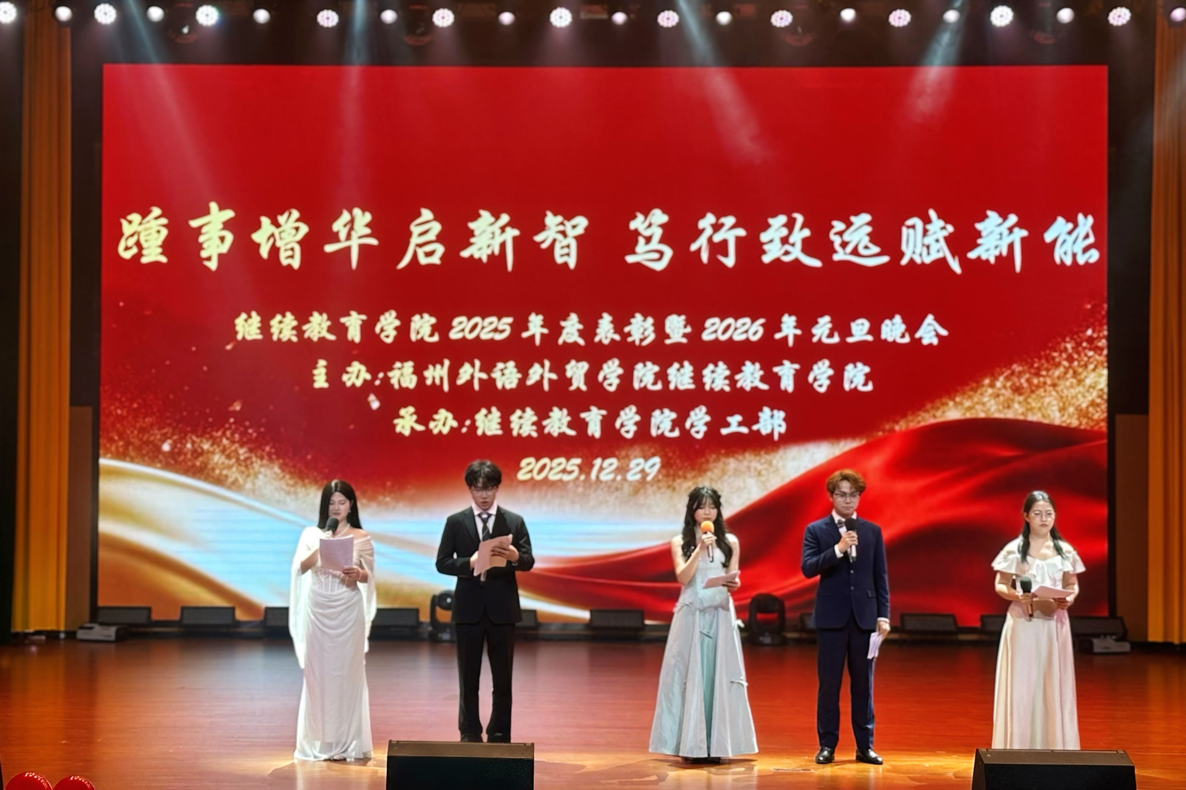 12月29日晚,华灯溢彩、乐声悠扬,继续教育学院2025年度表彰暨2026年“踵事增华启新智 笃行致远赋新能”元旦晚会在博雅音乐厅隆重举行。学院副院长(主持工作)田富豪、副院长安卉及各部门负责人、全体辅导员与全院学子欢聚一堂,共赴辞旧迎新视听盛宴,喜迎2026新年到来。