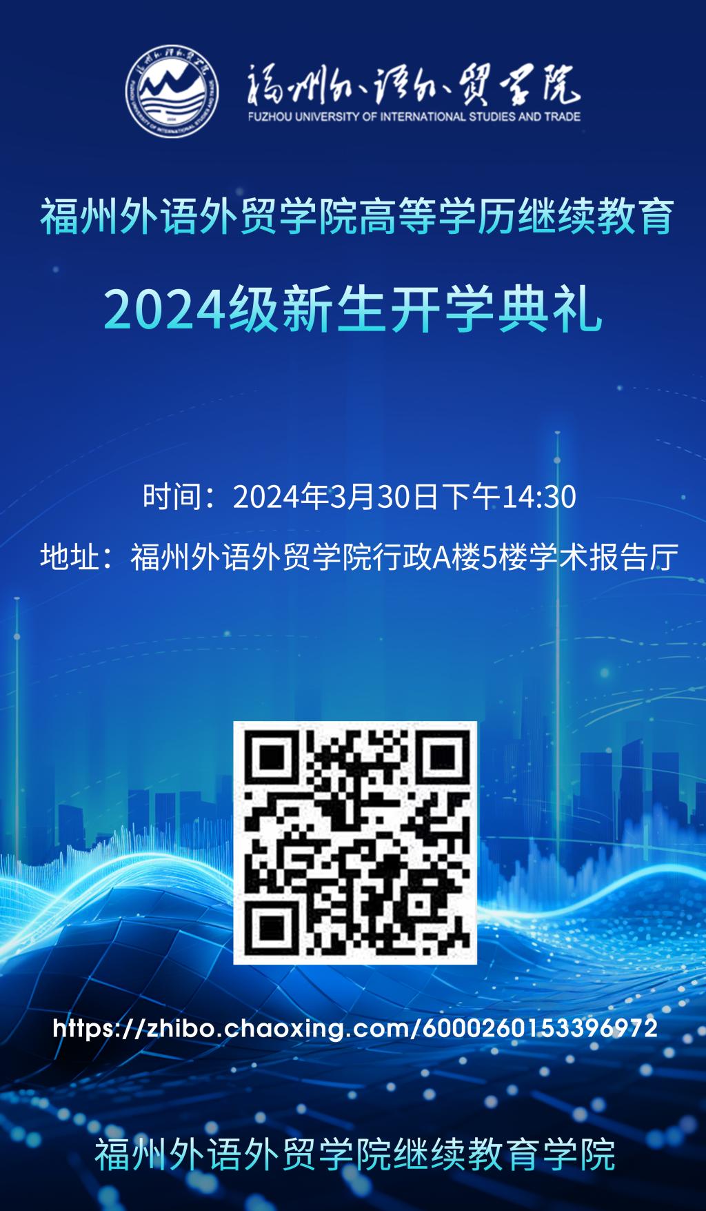 迟日江山丽,春风花草香。在这孕育着生机和希望的季节里,我们诚挚的邀请你参加福州外语外贸学院高等学历继续教育2024级新生开学典礼,让我们在这个美丽的春天里,共同迎接新学期的到来,携手成长!现将有关事项通知如下: