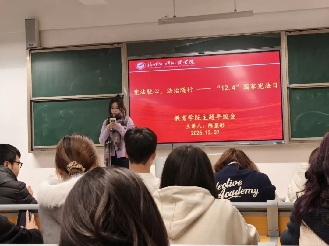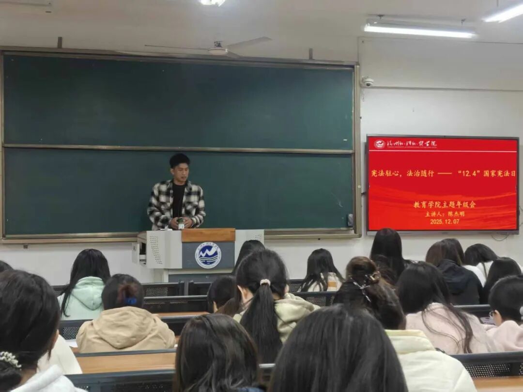 为提升学生法治素养与维权能力、营造尊法学法守法用法校园氛围,12月,教育学院紧扣“宪法驻心,法制随行——‘12.4’国家宪法日”主题,开展年级主题会。活动以校园案例解析、实时法治问答传递实用法律知识,让法治意识深植心中。