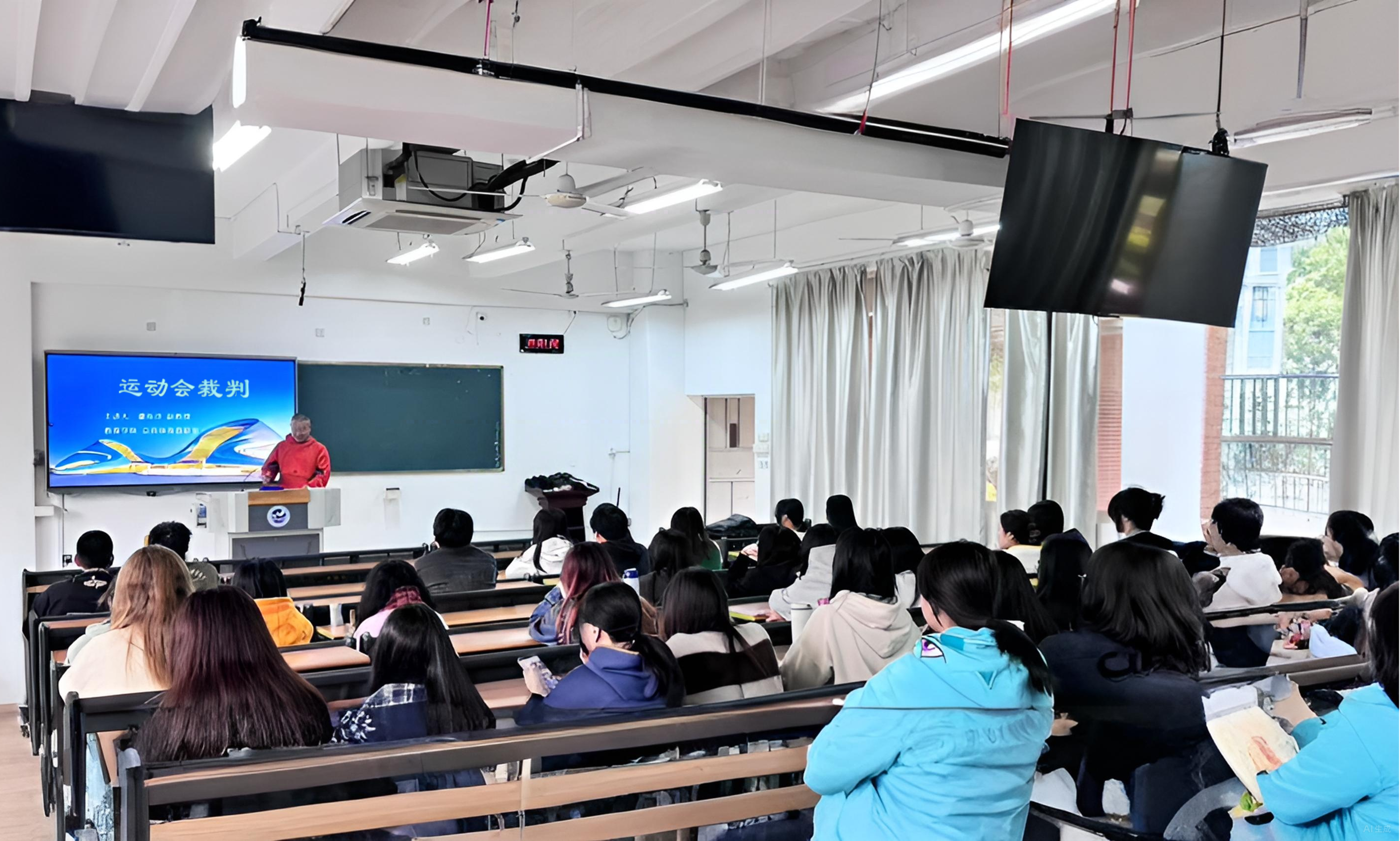 2025年11月25日下午,董海洋副教授在教1-101教室为即将参与校运动会裁判工作的学生开展了一场题为《运动会裁判》的专题讲座。现场座无虚席,气氛热烈,反映出同学们对裁判知识的高度关注与学习热情。