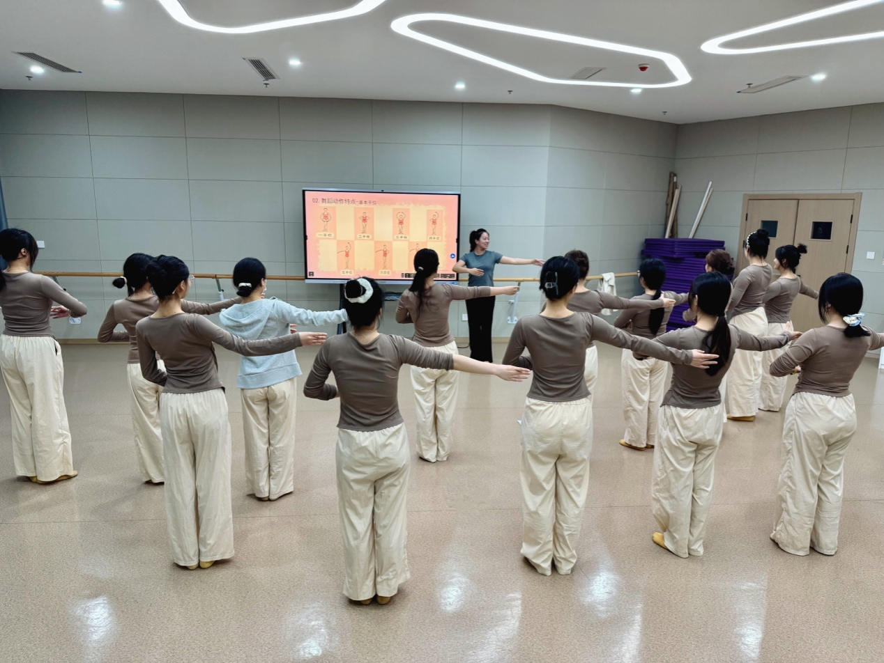 首先,郑焱老师结合视频资料,详细解析了芭蕾的“开、绷、直、立”四大基本要素,并邀请学生体验基础的芭蕾手位、脚位动作。她强调,芭蕾不仅是技巧的展现,更是身体控制力与艺术表现力的结合,如“挥鞭转”“大跳”等经典动作,既考验舞者的肌肉力量,也传递着丰富的情感表达。