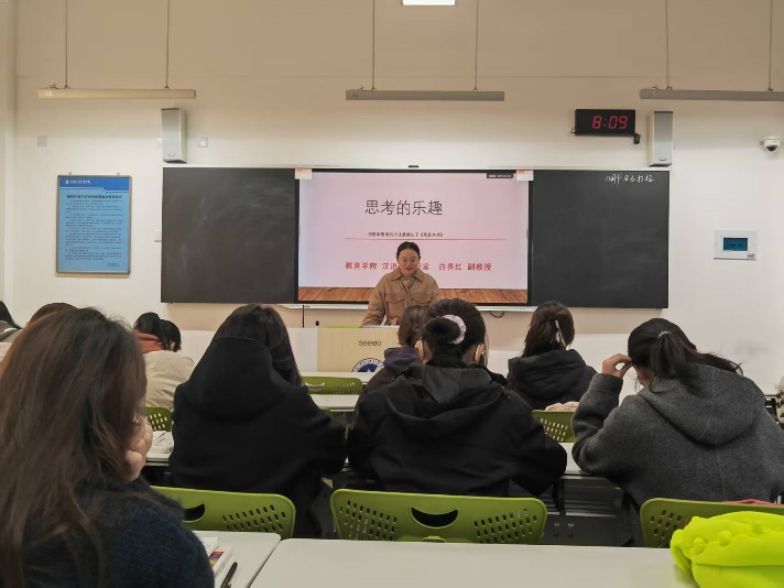 为助力学生提升思维能力,更深入地解读文学经典,12 月 2 日下午,教育学院白秀红副教授面向2025级小学教育本科专业学子带来了一场主题为《思考的乐趣 —— 用哲学思考的方法重读 <庄子>“呆若木鸡” 的故事》的专题讲座。