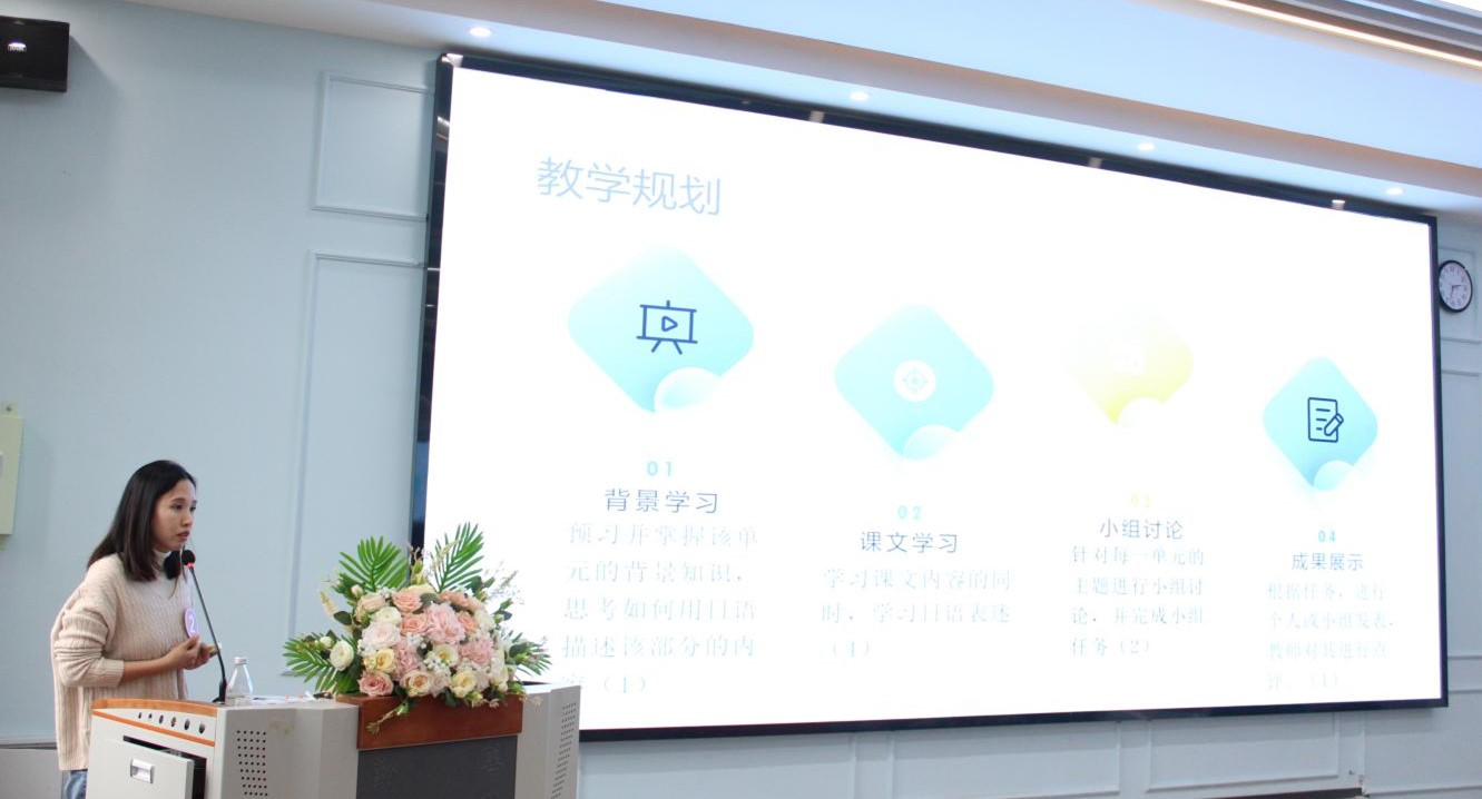 在比赛现场,各位参赛教师结合教学大纲与教学实践,进行了15分钟以内的教学设计创新汇报。丰富有趣的课堂内容、轻松活泼的课堂氛围或是设计精美的课件、层次缜密的逻辑、润物细无声似的思政元素引得现场掌声连连。期间,专家评委还依据选手的汇报进行提问交流,从寻找切入点、整理资料、思考学情,到设计教案、拓展延伸、梳理总结,一整个教学过程中,每一位老师都有自己独特的教学风格。