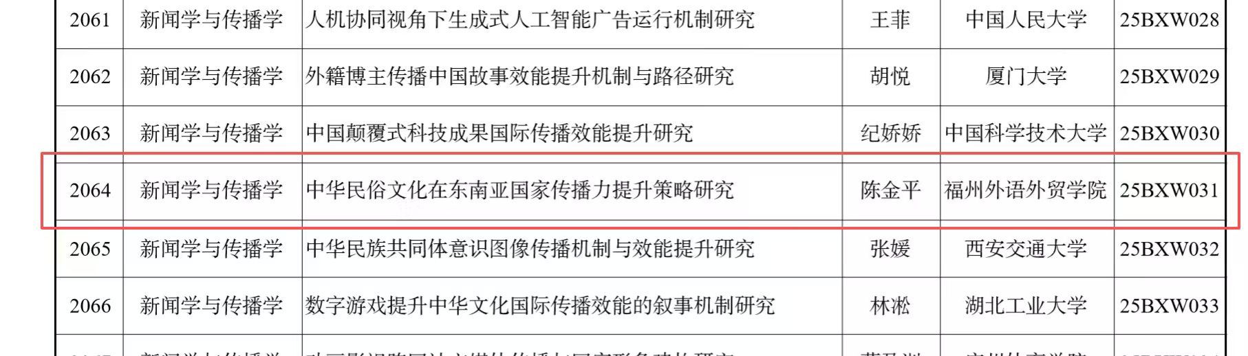 日前,全国哲学社会科学工作办公室公布了“2025年国家社会科学基金年度项目立项结果”,我院陈金平老师申报的《中华民俗文化在东南亚国家的传播力提升策略研究》获得国家社科基金一般项目立项。