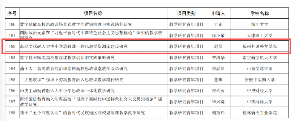 日前,教育部社会科学司公布2025年度高校思想政治理论课教师研究专项一般项目评审结果,我院赵昂老师申报的《海丝文化融入大中小学思政课一体化教学资源库建设研究》(教学研究青年项目)成功获批立项,为学院思政学科建设与地域文化育人实践再添新成果。