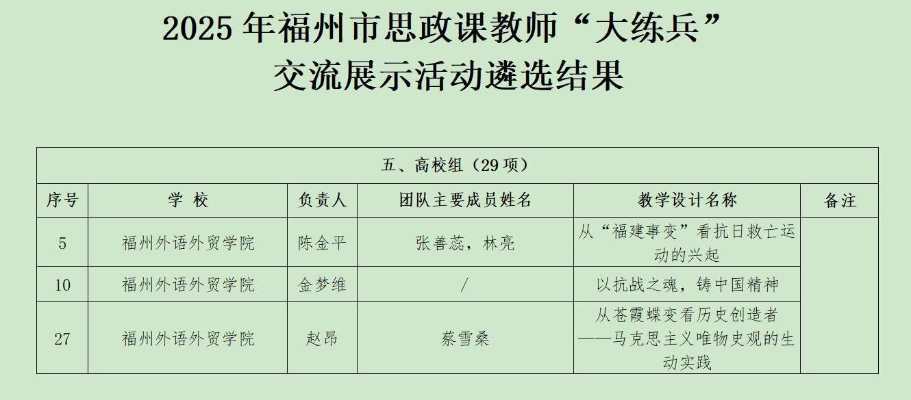 在夯实课程与团队建设的同时,我校思政课教师队伍的教学能力也在市级竞技舞台上得到充分检验。在刚刚落幕的“2025年福州市思政课教师“大练兵”交流展示活动”中,我校3名教师报送的教学设计凭借扎实的理论功底、精巧的教学构思和鲜明的时代特色,在全市遴选中脱颖而出,获评“示范课”。这不仅是对教师个人教学素养的高度肯定,更是我校长期以来坚持“以赛促教、以练促学”,全力打造政治强、情怀深、思维新、视野广的思政课教师队伍的集中体现。