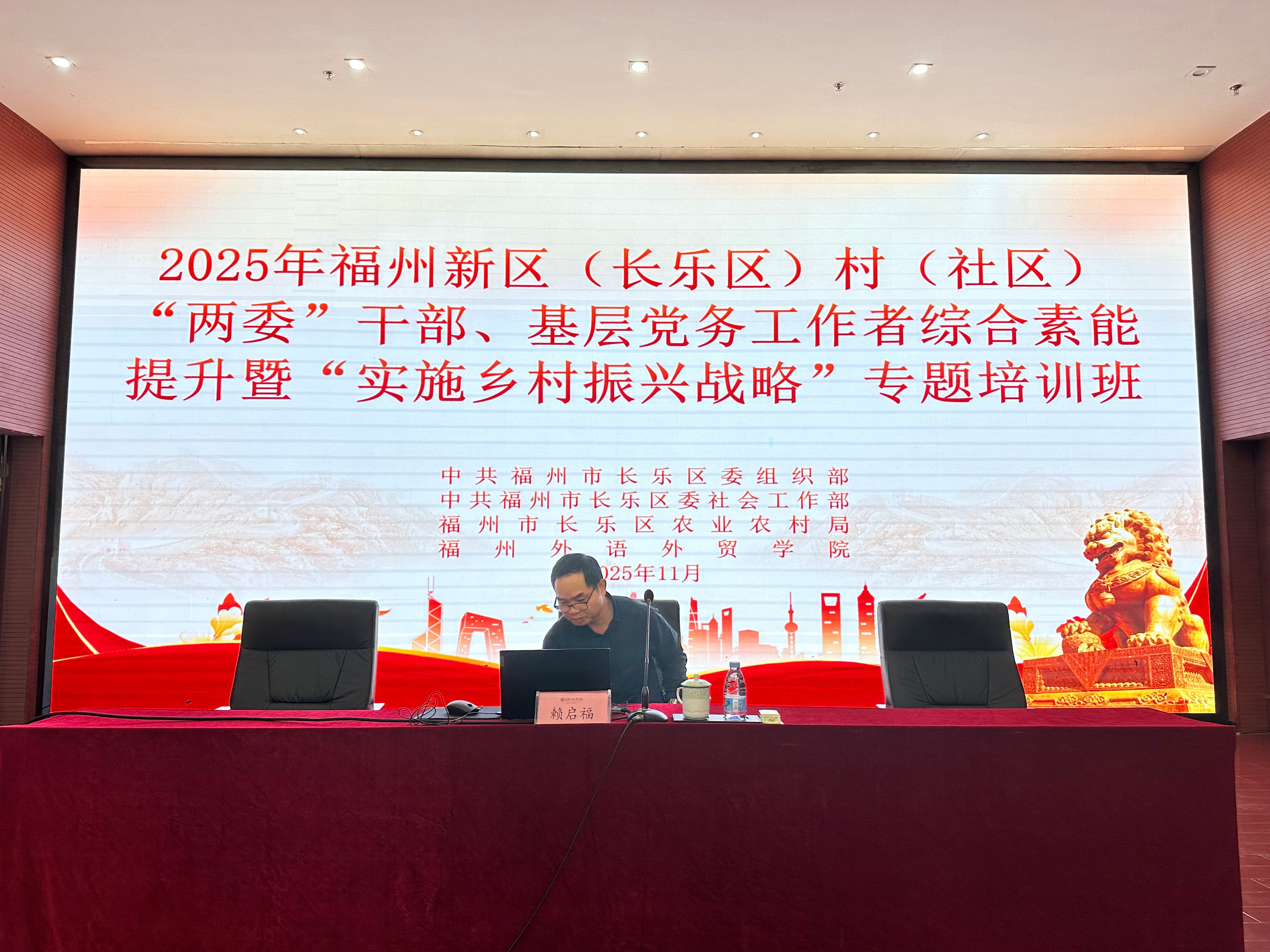 11月24日至11月28日,由中共福州市长乐区委组织部主办,福州外语外贸学院继续教育学院、马克思主义学院共同承办,福建省民办高校党建研究中心协办的“2025年福州新区(长乐区)村(社区)“两委”干部暨基层党务工作者综合素能提升培训班”在我校顺利举办。福州新区管委会副主任,长乐区委组织部部长程小马出席开班式并讲话,长乐区委组织部副部长、四级调研员,兼区公务员局局长吴国武主持开班仪式。