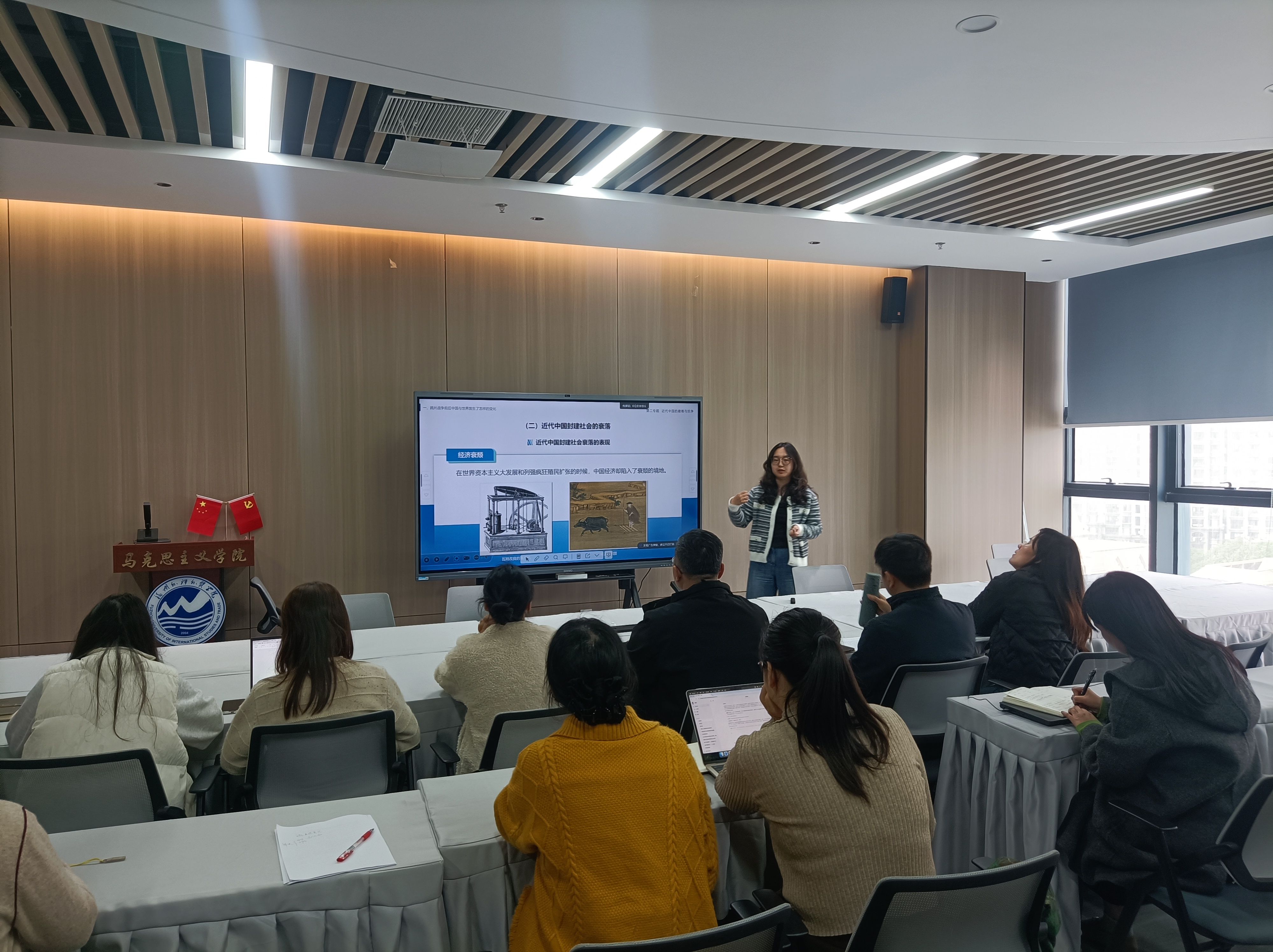 会议最后一个环节是集体备课,由亢婷炜老师主讲。亢婷炜老师一中国近现代史纲要专题二为例,分别从学习目标、重难点展开说课,大家针对所讲内容提出建议,共同讨论。会议结尾,杨惠菊主任做了会后总结,并安排了下次会议的相关工作